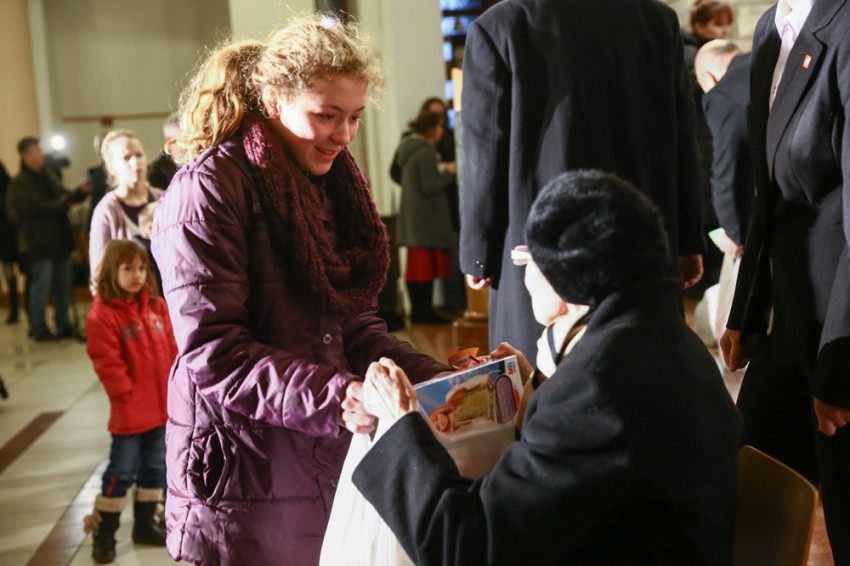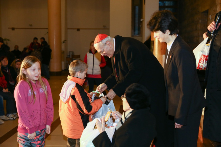 A bíborosi köszöntő után Erdő Péter és Mádl Dalma személyre szóló ajándékokat adtak át a jelen lévő, csaknem 300 gyereknek. A Budapest több plébániájáról érkező gyerekek között volt például Duka Jázmin és Blanka is, akik a 8. kerületi Béke Királynéja-templomhoz tartoznak. Csomagjaikban babákat, társasjátékokat, plüss állatkákat, írótáblát, és karácsonyi bejglit is kaptak.