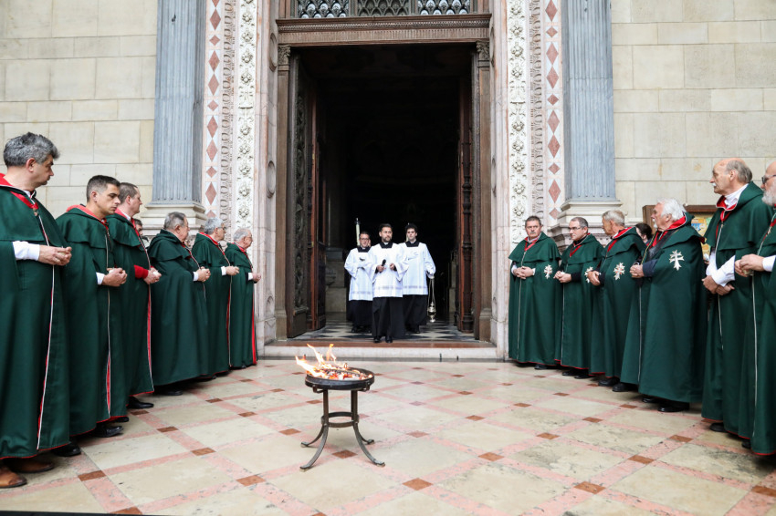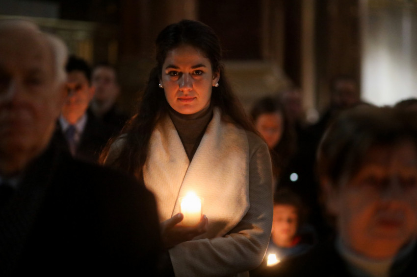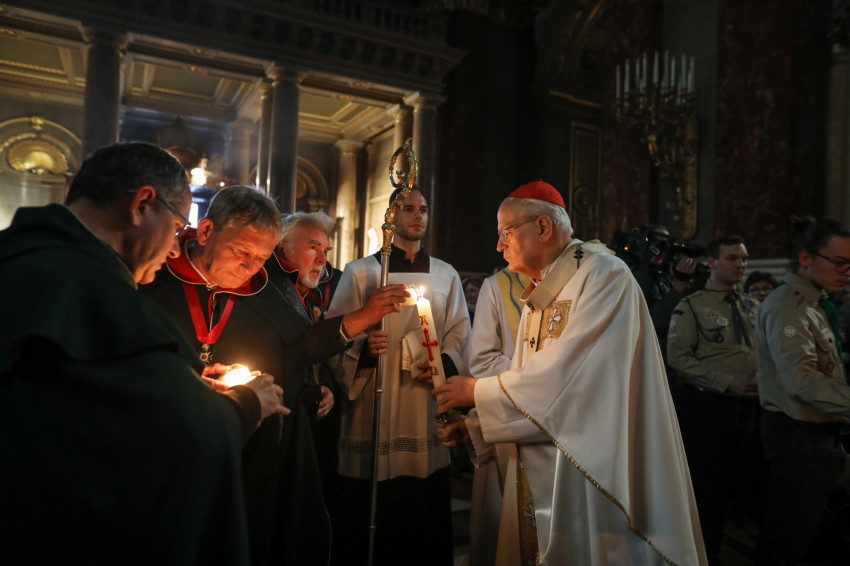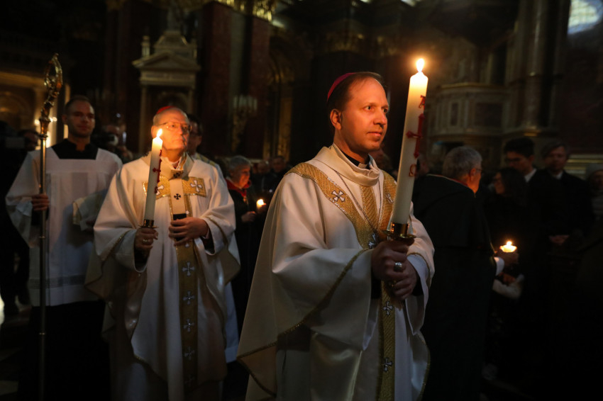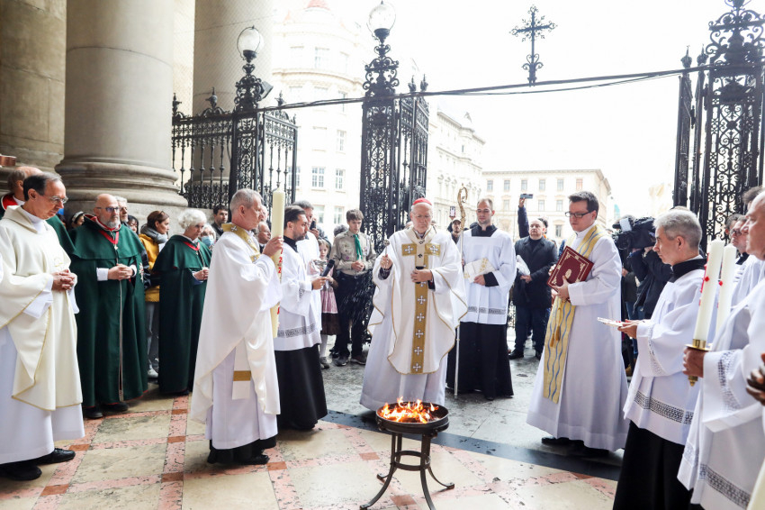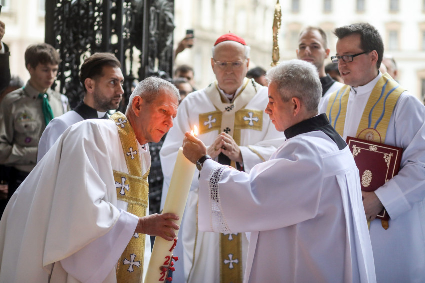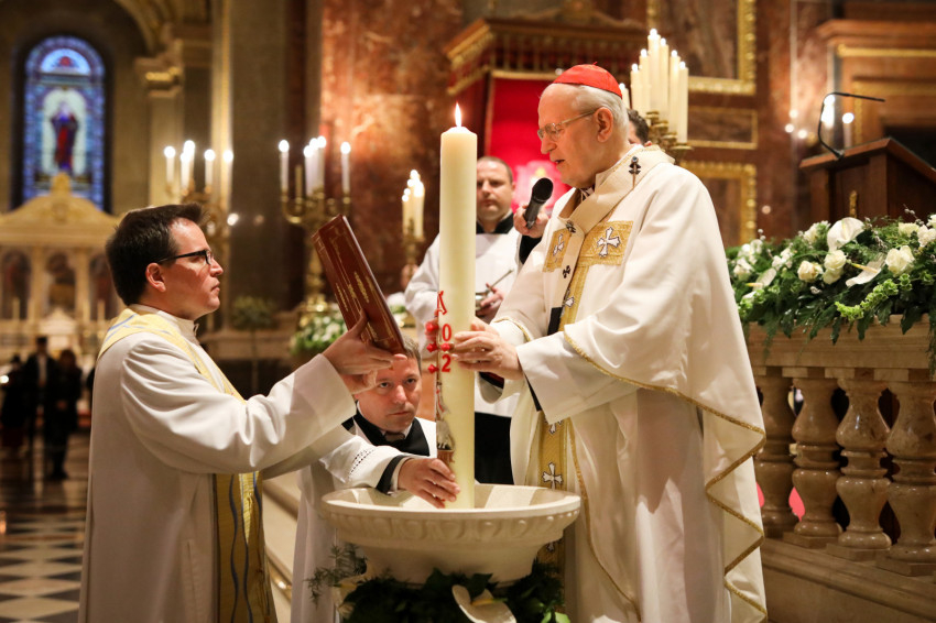 A bíboros által vezetett húsvéti vigília a bazilika lépcsőinél vette kezdetét a tűzszentelés szertartásával. Miután az esztergom-budapesti érsek megáldotta a tüzet, az arról vett lánggal meggyújtották a húsvéti gyertyát, amely a halott Jézus testét szimbolizálja, benne a tömjénszegekkel, ezek Jézus halálos sebeire utalnak. A gyertya élettelen testét megeleveníti az új tűz – ezzel a liturgia a föltámadás pillanatát jeleníti meg. A húsvéti gyertya fénye maga is Jézus Krisztust jelzi, s feltámadását, mely belevilágít a templom sötétjébe, de egyúttal a világ sötétjébe is, hogy új reményt adjon.