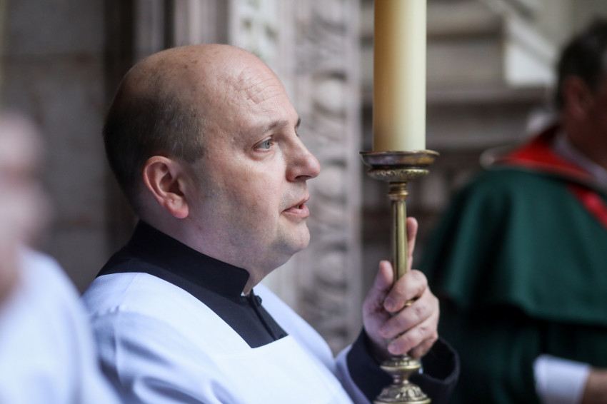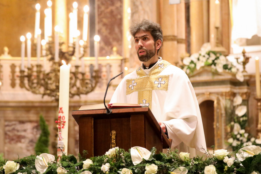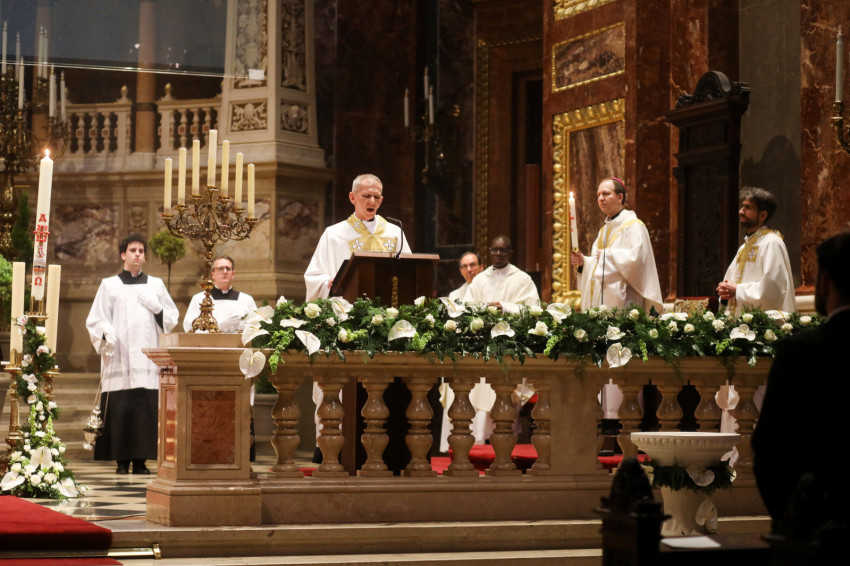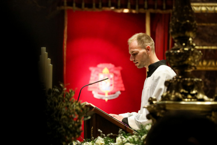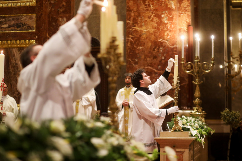 Miután a bazilikában a húsvéti gyertyáról meggyúltak a fények, felhangzott az Egyház leggyönyörűbb éneke, az Exultet, a húsvéti örömének. A húsvéti örömének az ünnep tartalmát részletezi, rávilágít, hogy a gyertya fénye miként szimbolizálja a feltámadást és a megváltást.