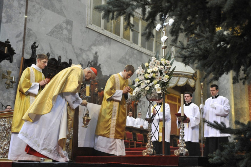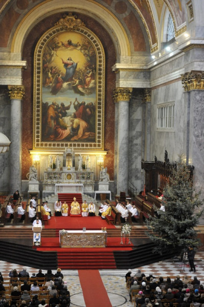 3. Egyházmegyénkben az idén kiértékeltük a több, mint négy évig tartó plébániai látogatások eredményeit. Sok szép és bíztató tapasztalatot szereztünk. A plébániák nagy részén élnek és működnek családokból álló közösségek is. De vannak elgondolkodtató jelek. Ilyen például a katolikusnak keresztelt újszülöttek arányának csökkenése, főként Budapesten. Fontos, hogy már a keresztény szülők újszülött gyerekeit is megkereszteljük, hogy a szülők kérjék számukra ezt a szentséget. Hogy a plébániák nagylelkűen teljesítsék a szülők kérését, ne támasszanak önkényes, szigorú feltételeket, hanem Szentatyánk útmutatását követve szeretettel fogadjanak mindenkit, aki közeledik. Mert a keresztség kapcsol minket Krisztushoz. Az isteni kegyelem képes megkezdeni munkáját már egy újszülött gyermek lelkében is. Isten titkainak erőterében élünk, nem szabad önmagunkat csak földies módon szemlélni. Többek vagyunk, és többre vagyunk hivatva, mint amire becsüljük magunkat. Hisszük, hogy Isten itt, a mi egyházmegyénkben is többet akar ajándékozni nekünk és a körülöttünk lévő világnak, mint amit kérünk vagy megértünk. Nyissuk hát tágra szívünkben is az irgalmasság kapuját, fogadjuk be a betlehemi Újszülöttet, aki maga a világosság! Engedjük, hogy fénye elborítsa lelkünket és beragyogja a világot! Amen.