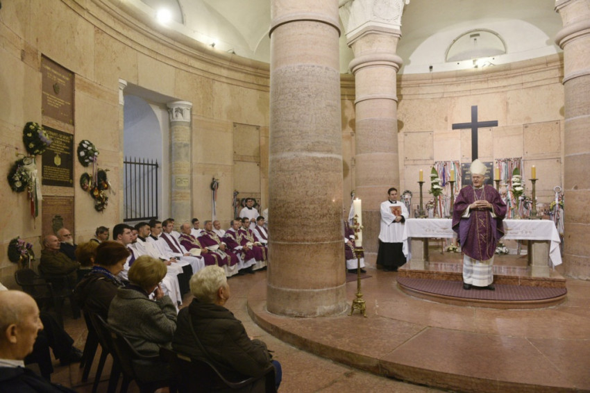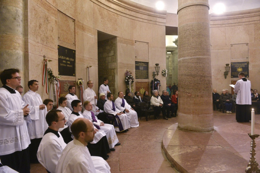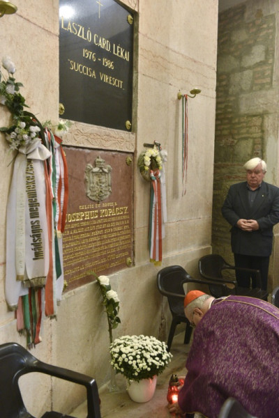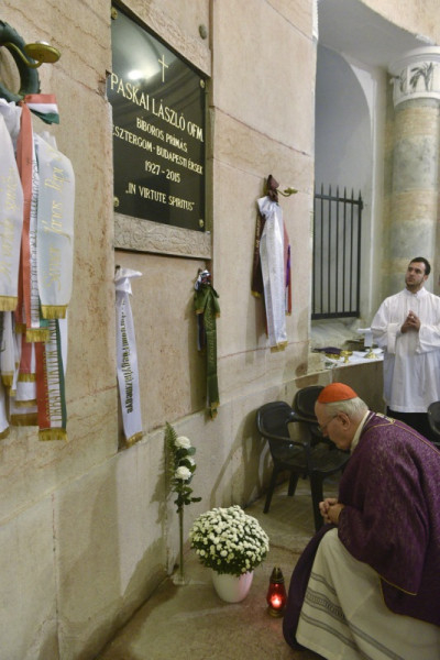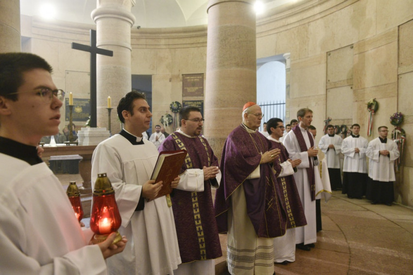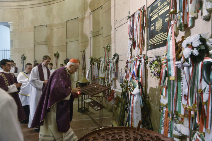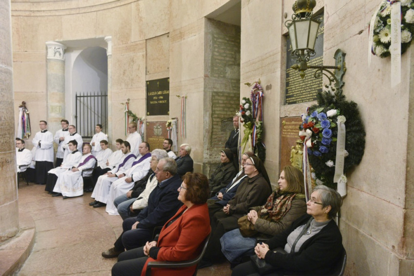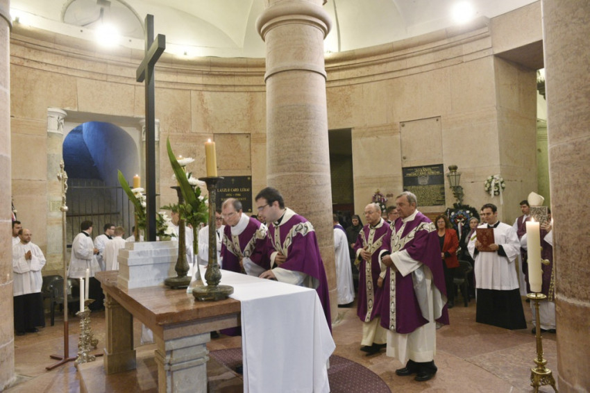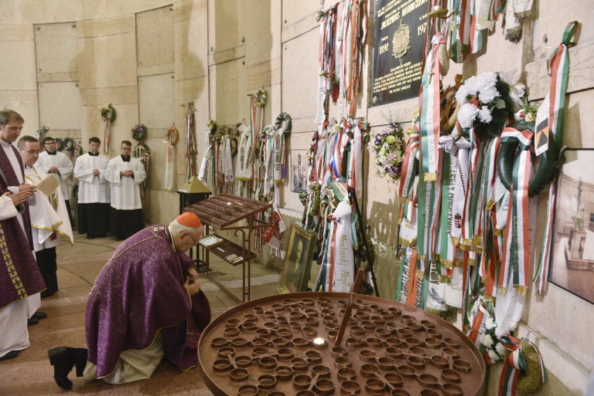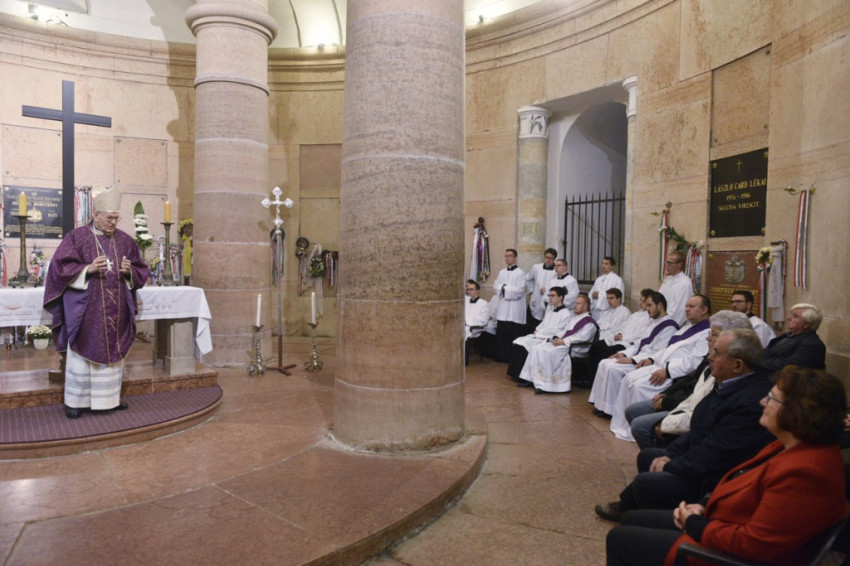 Halottak napja reggelén Erdő Péter bíboros, prímás szentmisét mutatott be az esztergomi bazilika altemplomában, majd mécsest helyezett el elődei sírjainál.
