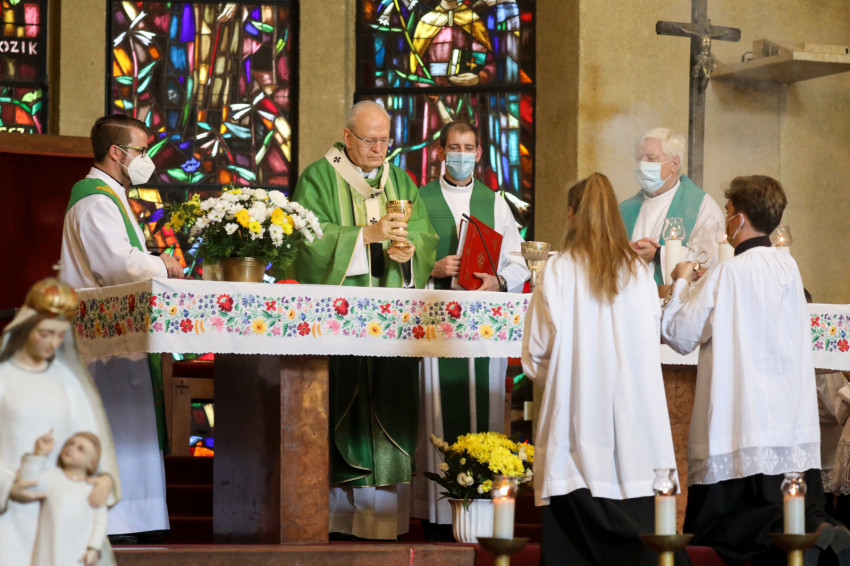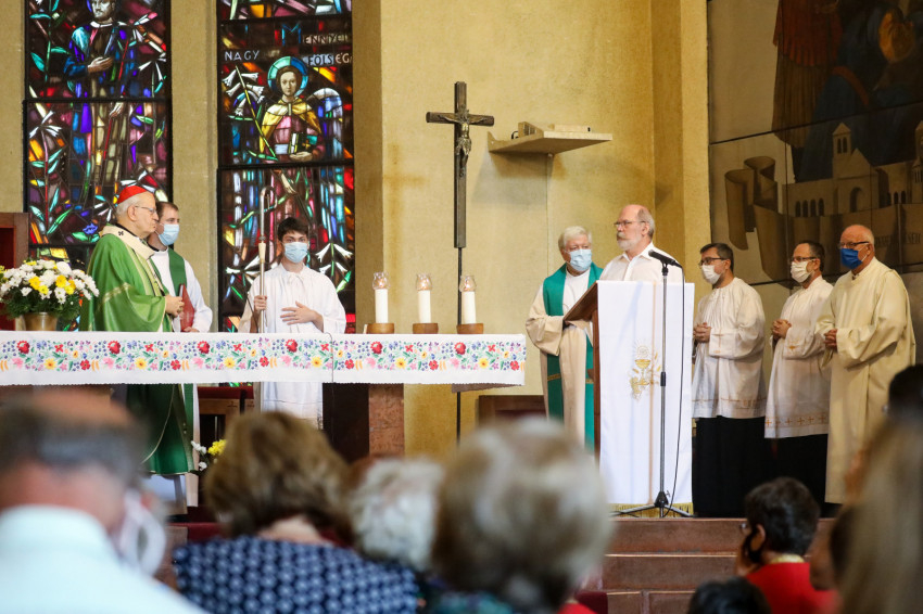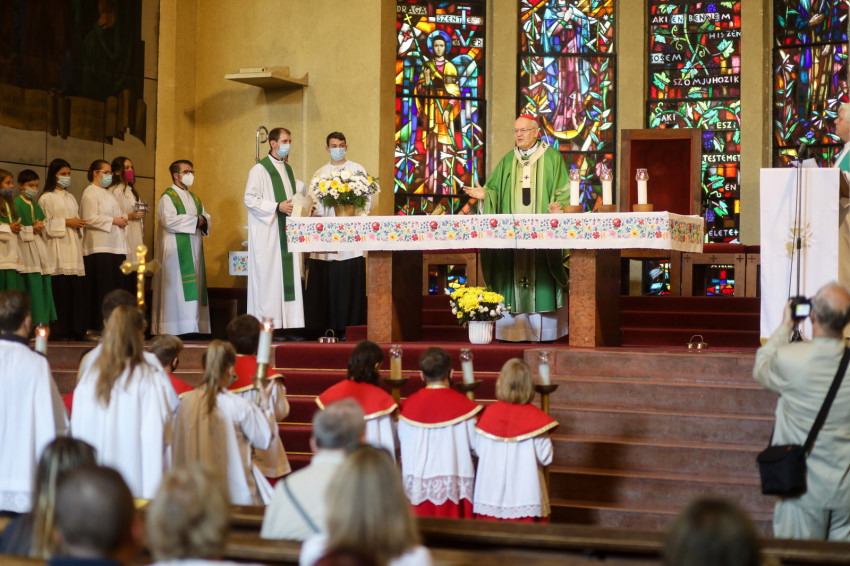Az ünnepi szentmise főcelebránsa és szónoka Erdő Péter bíboros, prímás volt. Koncelebrált a Lambert Zoltán plébánost 53 év után váltó Forgács Alajos plébános és a júniusban szentelt Máté Kristóf káplán.
