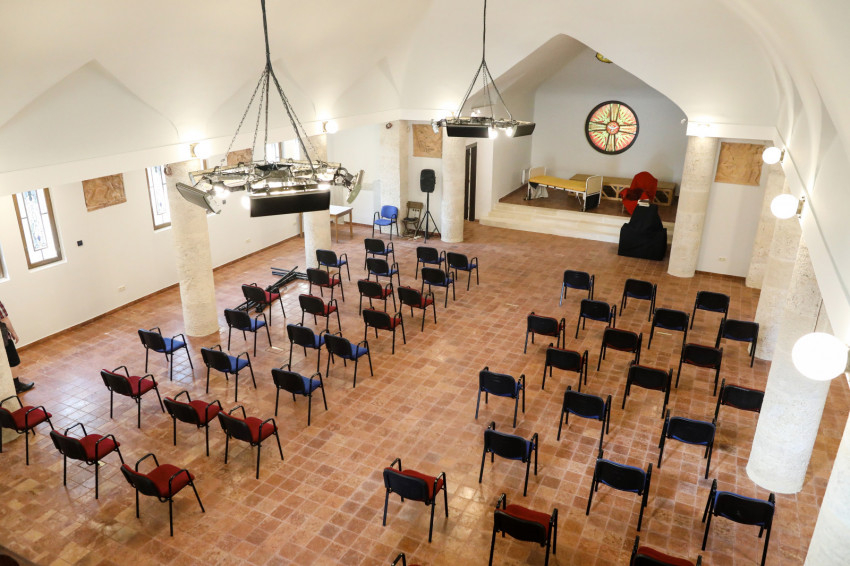 Az ünneplő közösség az asszisztencia vezetésével vonult át a kistemplom megáldására. Az egykori szentélyben színházi díszlet fogadta a belépőket. Este adják elő ugyanis Tar Ildikó Láng a sötétben című, Márton Áron életét feldogozó legendáját.