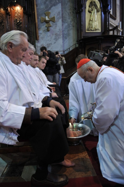 A homíliát követően Krisztus tettére való emlékezésként Erdő Péter az esztergomi plébániákhoz tartozó 12 férfinak mosta meg a lábát a szertartás keretében.