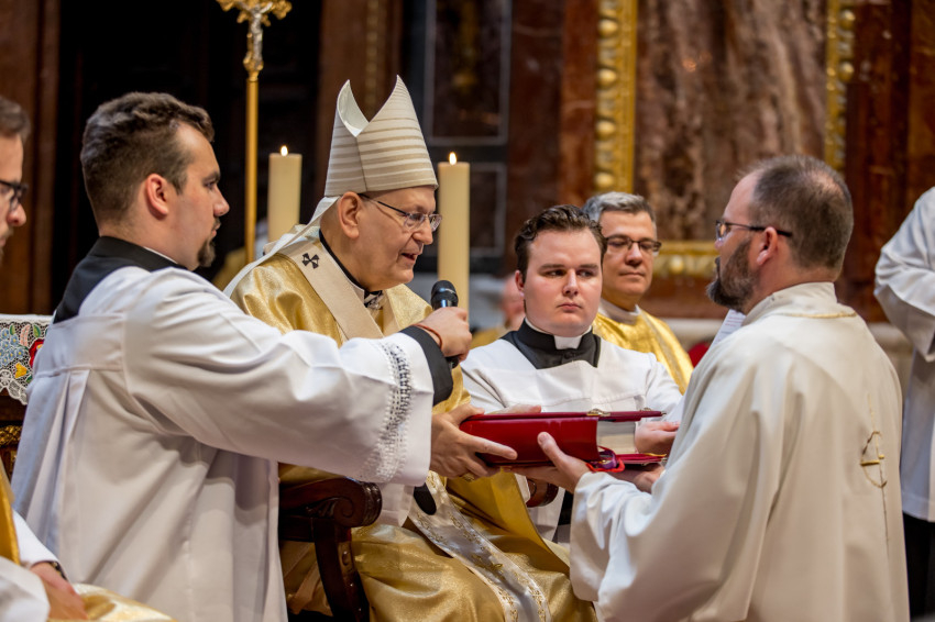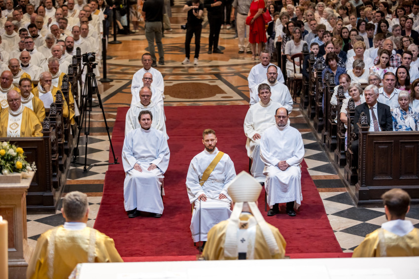 Megtelt ünneplőkkel a Szent István-bazilika szombaton délelőtt. Együtt ünnepelt a főpásztorral Marton Zsolt váci megyéspüspök; Fábry Kornél, Martos Levente Balázs és Mohos Gábor, a főegyházmegye három segédpüspöke; egyházmegyés papok és diakónusok, szerzetesek, a szentelendők családtagjai, hozzátartozói és a plébániáikról érkezett ünneplők. Erdő Péter a szertartás kezdetén köszöntötte az ünnepi szentmisén koncelebráló jubiláns papokat és a bazilikát megtöltő híveket.