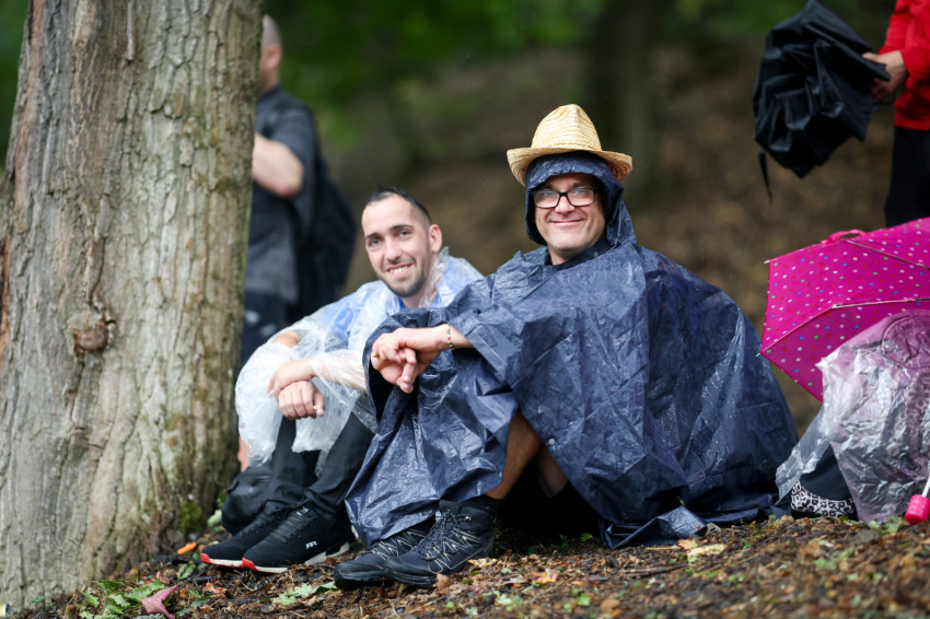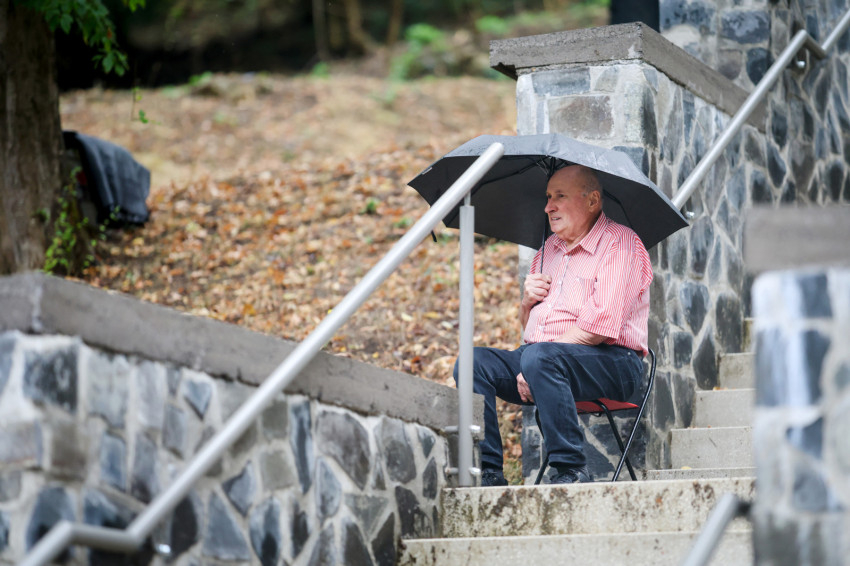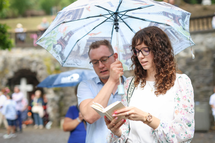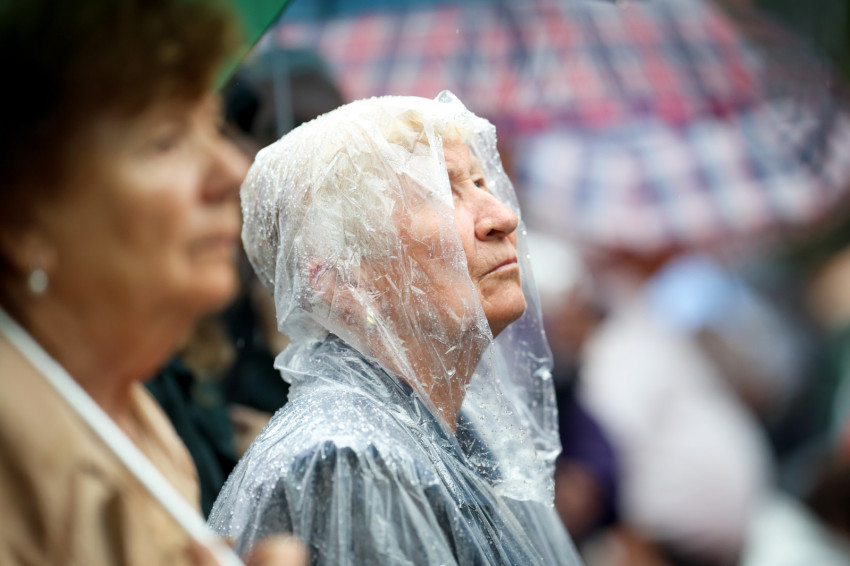 Az eső egyre inkább eleredt, de a zarándokok teljes fegyelmezettséggel hallgatták a szentmise olvasmányait. A szakadó eső aztán a bíboros prédikációja alatt elállt.