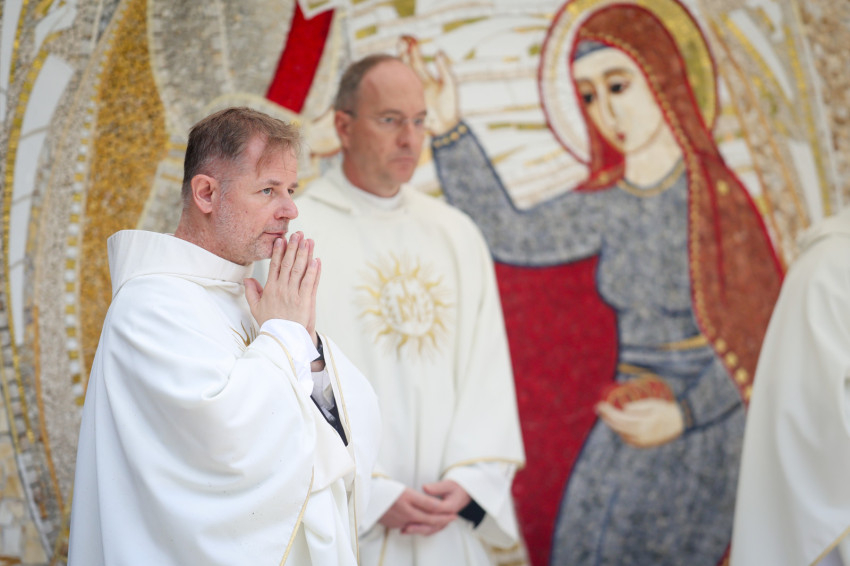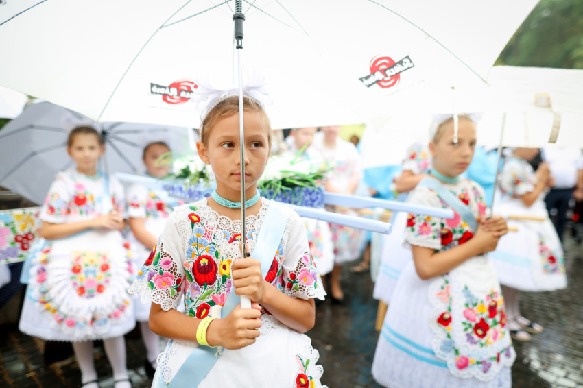 Harangszóra a bazilikába vonult Erdő Péter és Orosz Lóránt kegyhelyigazgató, elimádkozták a szentmise előtti imádságot, majd ünnepélyesen kivonultak a szabadtéri oltárhoz. Szép szakmári lányok vitték a Mária-szobrot népviseletbe öltözve, miközben felhangzott az ének a refrénnel: „Nem vagyunk árvák, van édesanyánk, ki a magas mennyekből gondot visel ránk, palástoddal takarj be, úgy vigyázz reánk.”