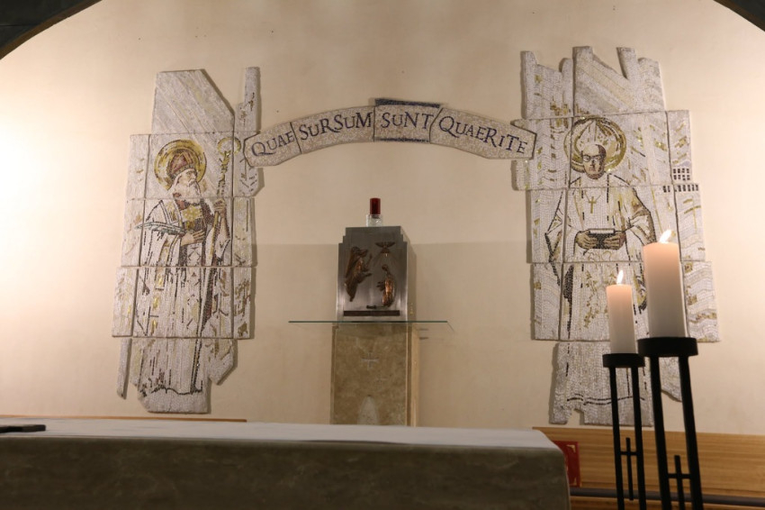 A szentbeszédet követően Erdő Péter bíboros megáldotta a templom mostanra elkészült három mozaikját, amelyek Tölg-Molnár Zoltán Munkácsy Mihály-díjas festőművész alkotásai. A szentélyben lévő nagyméretű, körülbelül 14 négyzetméteres kép a templom védőszentjét, Boldog Meszlényi Zoltánt, valamint a plébánia és a főegyházmegye védőszentjét, Szent Adalbertet ábrázolja. A jobb oldali keresztelőkápolna mozaikján a feltámadt Krisztus, a bal oldali mellékkápolna hátfalán pedig Szűz Mária látható a gyermek Jézussal. A felhasznált kövek nagyobb részben muranói üvegmozaikok, kisebb részben hazai alapanyagból készültek.
