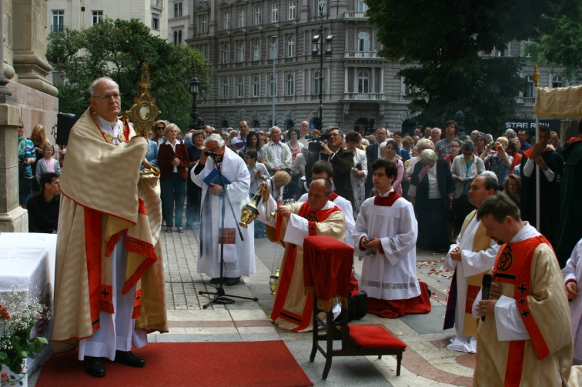 A hagyományosan Szentháromság ünnepét követő vasárnapon tartott úrnapi szentmisén a Szent István-bazilikában részt vettek a Szent István Lovagrend tagjai. Nagy számban megjelent hívő közösség előtt mutatta be az ünnepi szentmisét Erdő Péter bíboros.