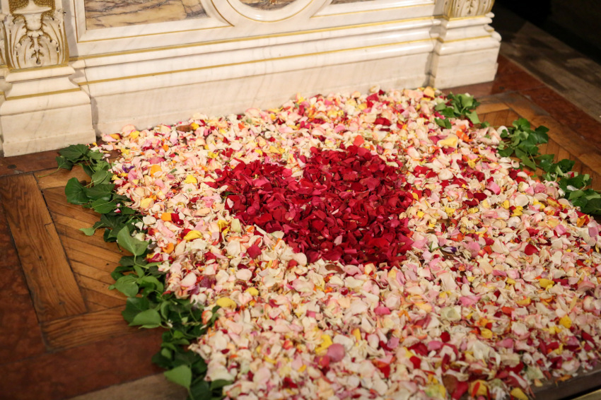 Az eső miatt csak a bazilikán belül tudták megtartani a körmenetet, így a látványos virágszórás elmaradt, de így is gyönyörű virágdíszek köszöntötték az Oltáriszentségben jelen lévő Krisztust.