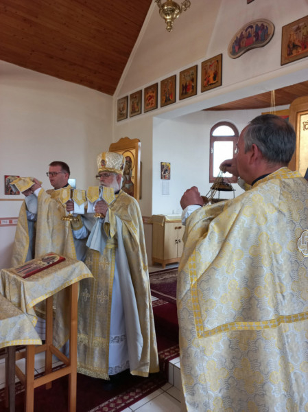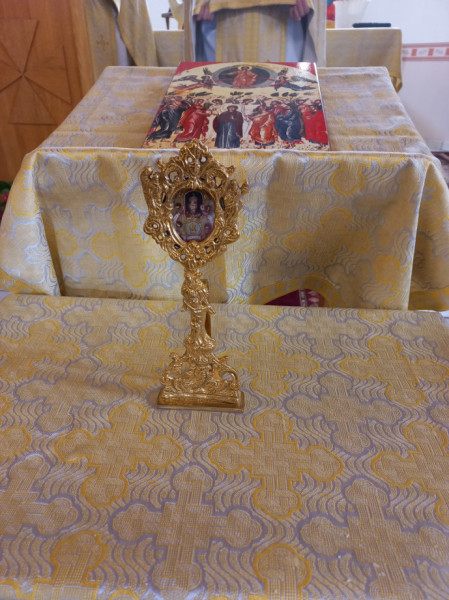 A Szent Liturgia végén megtartottuk a körmenetet a szokásos evangéliumolvasásokkal, majd a himnuszok és éltetések után nem mindennapi eseményben részesülhettek az ünneplők: Szent István királyunk ereklyéjével kaptak áldást, ami az ünnepség megható csúcspontját jelentette.