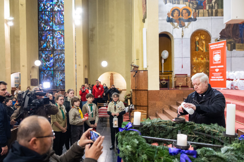 Ezután cserkészek vitték a betlehemi lángot az adventi koszorúhoz. Meggyújtották immár mind a négy gyertyát.