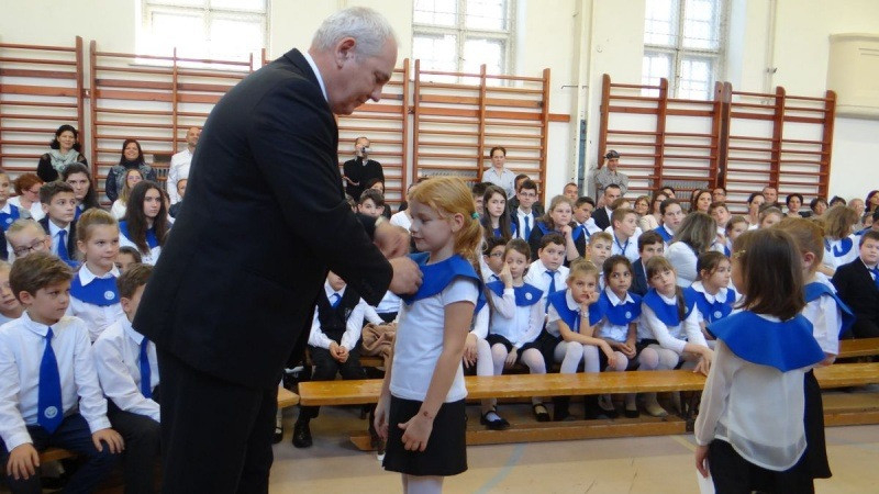Csák Lajos igazgató ünnepélyesen átadta az új diákoknak a Szent Imre-iskolás gallérokat és nyakkendőket, majd kézfogással befogadta őket az iskola közösségébe. Ugrits Tamás püspöki biztos egy-egy kereszttel ajándékozta meg az elsősöket, hogy mindig emlékezzenek Isten odaadó, igaz szeretetére.