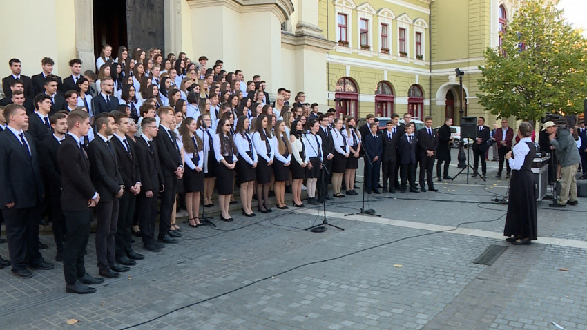 A szentmise után az andrássys diákok élőképen jelenítették meg az intézmény címerét, majd az iskola százfős kórusa énekelt a Dobó téren.