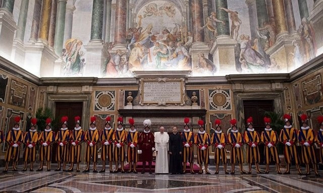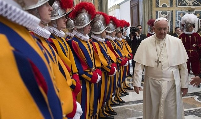 Május 7-én, szombaton délben az Apostoli Palota Kelemen termében fogadta Ferenc pápa a Pápai Svájci Gárda tagjait és beszédet intézett hozzájuk, szeretettel köszöntve az előző napon esküt tett újoncokat és családtagjaikat. Beszédében három témát érintett: a hitben való növekedést, az egyház egyetemességének a tapasztalatát és a testvériség megtapasztalását.