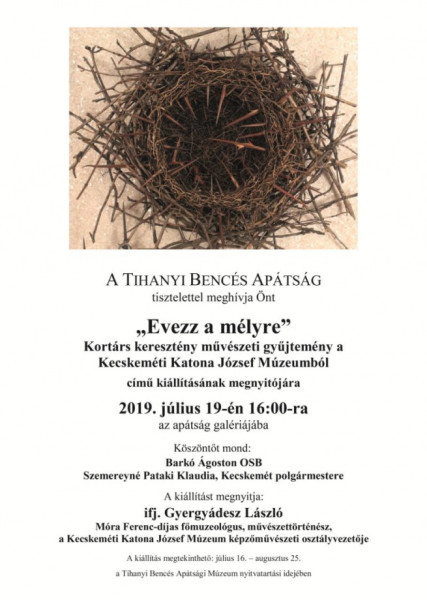 A tihanyi tárlaton látható válogatás keretében a kecskeméti gyűjtemény mintegy nyolcadát, 53 alkotó 56 művét mutatják be. A július 19-én, pénteken 16 órakor kezdődő megnyitón köszöntőt mond Barkó Ágoston OSB, az apátság gyűjteményének felelőse és Szemereyné Pataki Klaudia, Kecskemét polgármestere. A kiállítást a gyűjteményalapító kurátor, ifj. Gyergyádesz László művészettörténész, a Kecskeméti Katona József Múzeum képzőművészeti osztályának vezetője nyitja meg.