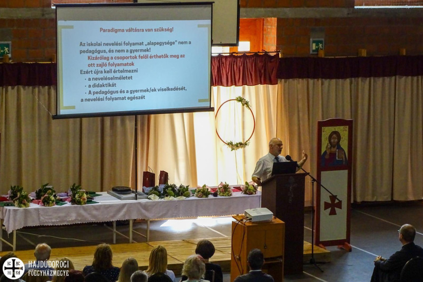 Az Isten tervébe beleférnek ezek a kudarcok, nehézségek, amelyeket mintegy jelzésképpen kapunk, hogy akkor valami még több, valami még nagyobb áldás következik. Így tekintsünk vissza kudarcainkra, fájdalmainkra. Az Istenfélő ember ilyenkor megerősödik a hitben, a jó pedagógus még felvértezettebben folytatja a munkáját. Hiszen az Istenfélő ember örömét és kudarcait is képes az Isten szemével látni – fogalmazott Kocsis Fülöp. A tanítás végén felidézte a tanév jelmondatát: „Úgy kell ragyognotok, mint a csillagoknak a mindenségben” (vö. Fil 2,15).