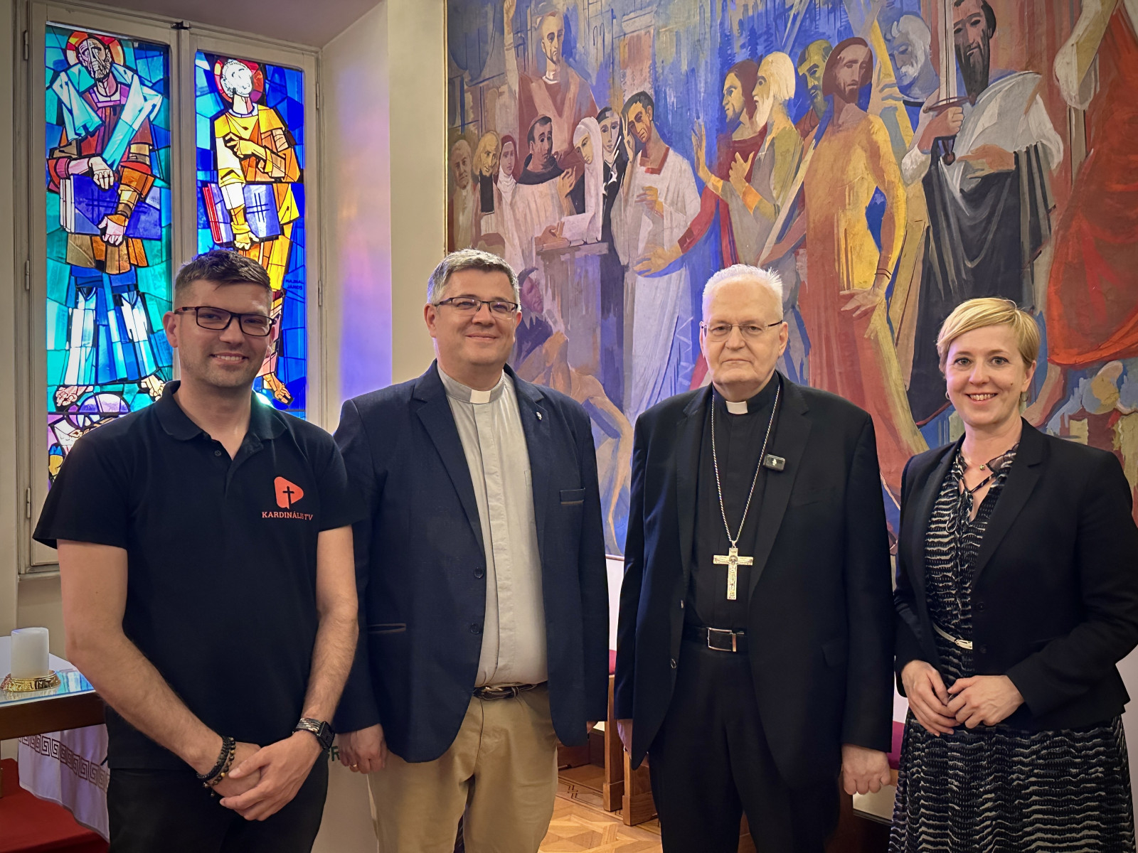 Fotó: Esztergom-Budapesti Főegyházmegye (a felvételen Zsuffa Tünde sajtószóvivő, Daubner Tibor szerkesztő, operatőr és Kuzmányi István állandó diakónus, főszerkesztő látható)