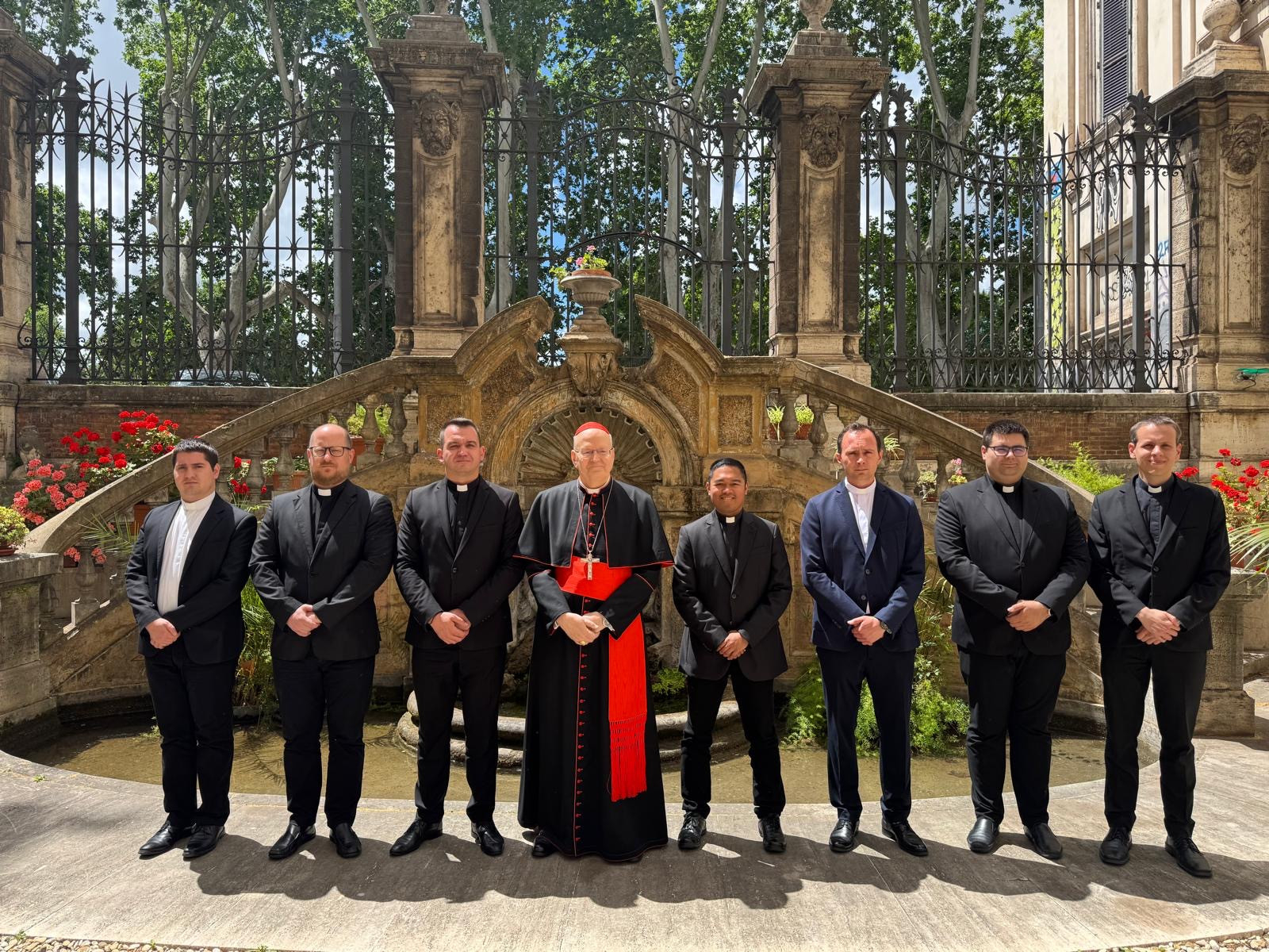 Az indulás előtti csoportkép a Pápai Magyar Intézetben: Törő András rektor, Benedict Tajos (Egri Főegyházmegye), Farkas Ferenc (Esztergom-Budapesti Főegyházmegye), Palatinus Kristóf (Győri Egyházmegye), Péter Vilmos (Egri Főegyházmegye), Resch András (Egri Főegyházmegye), Tóth László Gábor (Debrecen-Nyíregyházi Egyházmegye).