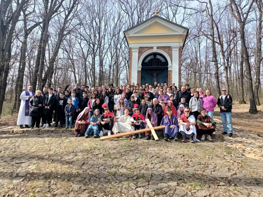 Az ebéd és a kötetlen beszélgetés után keresztúti ájtatosság következett a kegytemplom mögötti stációknál. A keresztút minden állomásán az elmélkedést az arad-ségai plébánia fiataljai vezették, rövid passiójeleneteket bemutatva.