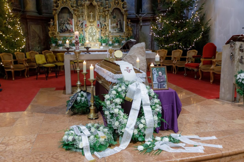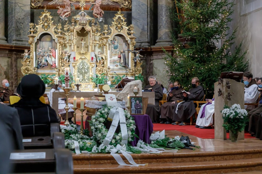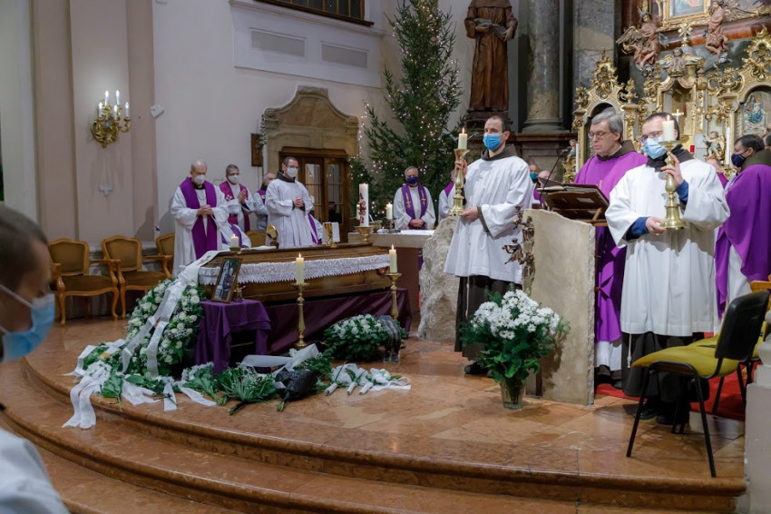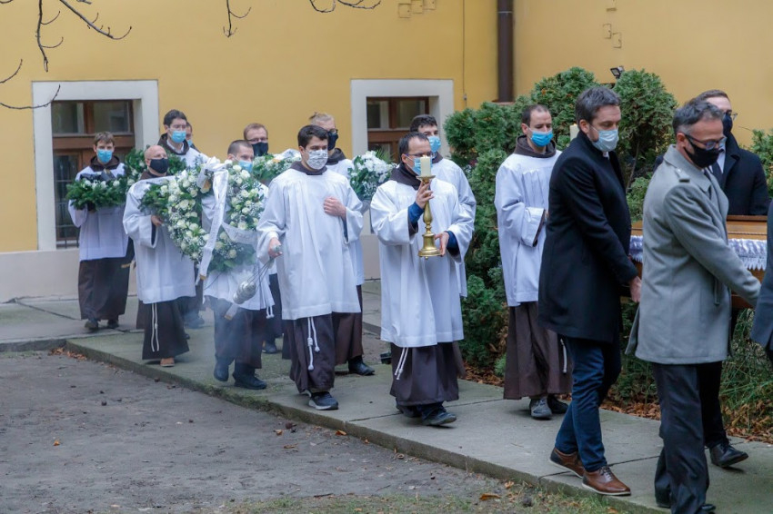 A megható visszaemlékezések után a koporsót a rendház kriptájában tették végső helyére: ide már csak a szűk család követte az asszisztenciát, a templomban maradottak a kivetítőn figyelhették a szertartást.