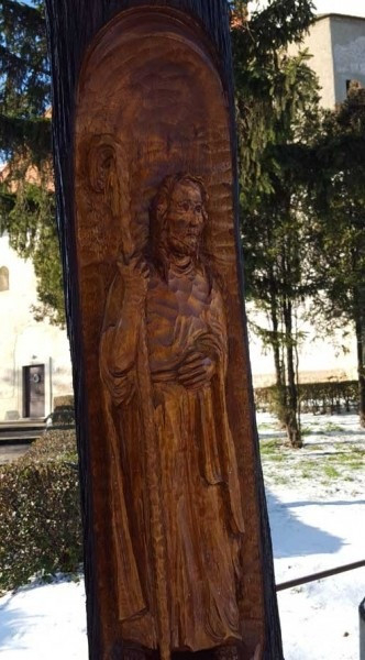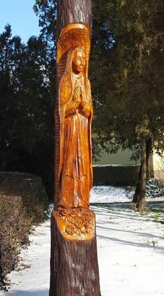 A hegyeshalmi Szent Bertalan-templom belső felújítása lassan a végéhez közeledik. Környéke is egyre szépül, hogy a plébánia közössége 2017-ben méltón ünnepelhesse meg felszentelésének 800. évfordulóját. A templomba vezető lépcsőket fák szegélyezik. Némelyik már nagyon idős, vagy olyan magas, hogy koronája eléri a közelben húzódó elektromos vezetéket. A kivágás várt rájuk. Az egyházközség néhány tagjának az az ötlete támadt, hogy a fákat meghagyva szobrokat faragtassanak a törzsükből. Az ötlet megvalósult, és 2015-ben két barlangszerű faragás készült: az egyik törzsbe a Jó Pásztor, a másikba pedig a Lourdes-i Szűzanya alakját faragták bele.