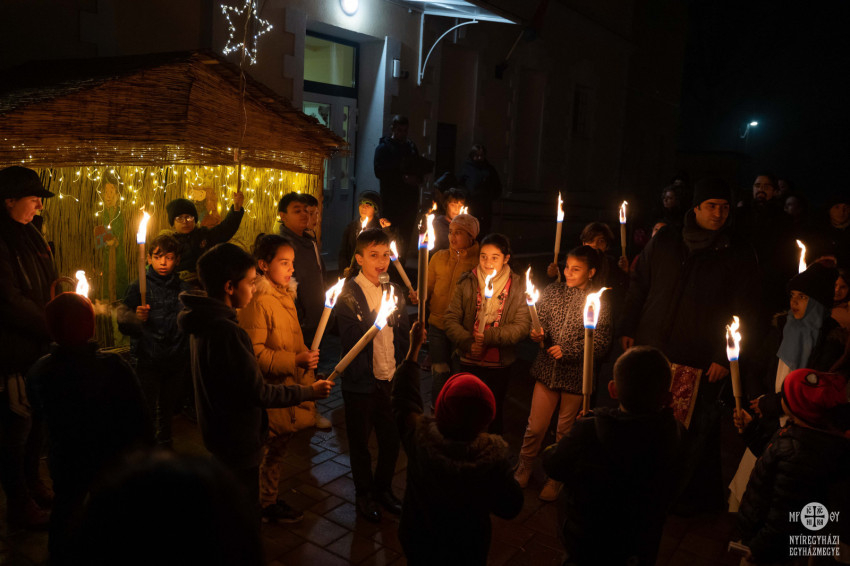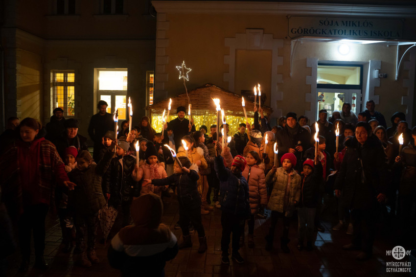 A menet már Szocska A. Ábel püspök kíséretével érkezett a Sója Miklós Görögkatolikus Általános Iskola épülete elé felállított betlehemhez.