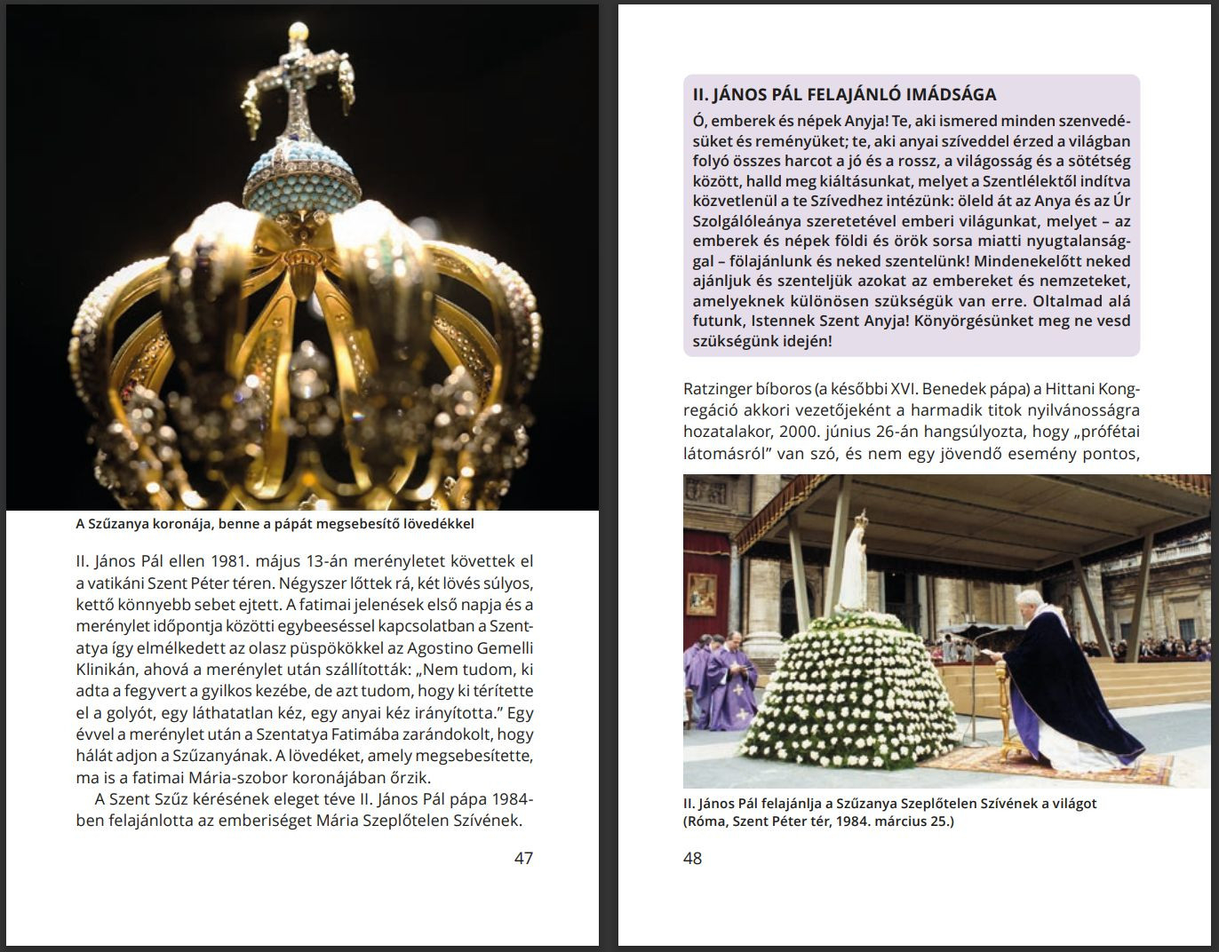 Ott állt a kereszt alatt, ajándékba kapott egy tanítványt és vele mindannyiunkat, mi pedig ajándékba kaptuk őt mint égi Édesanyát. Ismerve Kuzmányi Istvánnak, e könyv szerzőjének jó szolgálatát, szeretettel ajánlom az Olvasók figyelmébe ezt a zarándokútikönyvet, bízva abban, hogy segítségünkre lesz, s Fatima titkán keresztül meghalljuk a Szűzanya hívását az imádságra, az engesztelésre, a folyamatos megtérésre.