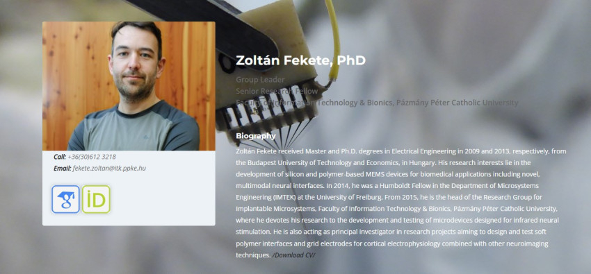 Fekete Zoltán PhD fokozatát 2013-ban szerezte. A Nemzeti Agykutatási Program csoportalapítási támogatásával tért haza 2015-ben a Freiburgi Egyetem Insitut für Mikrosystemtechnik intézetéből. Azóta vezeti az Implantálható Mikrorendszerek Kutatócsoportot a PPKE ITK berkeiben. Számos magas presztízsű szakfolyóirat és különböző európai kutatási pályázatok rendszeres bírálója.