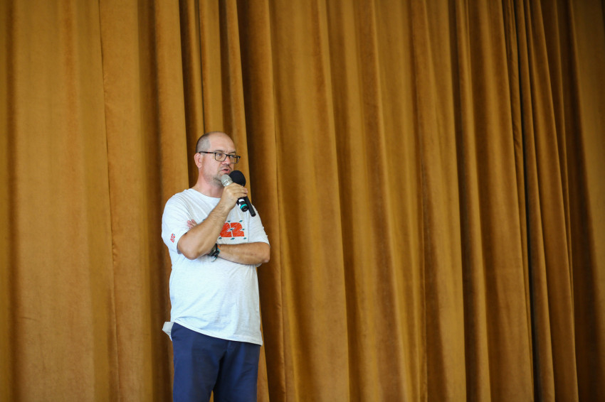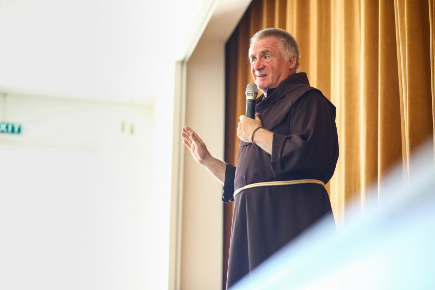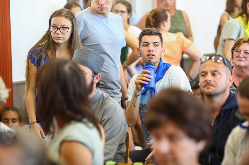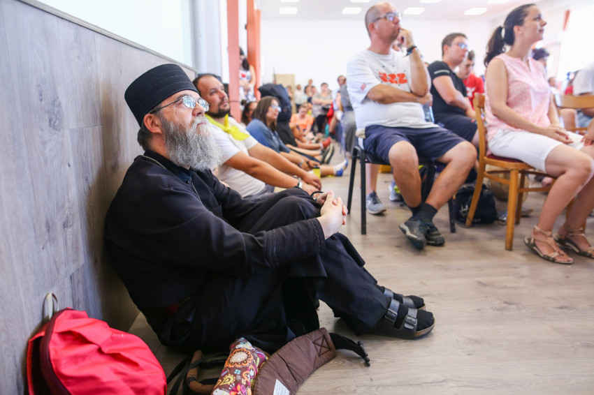 Miután megérkeztek, Böjte Csaba előadására gyülekeztek az ifjú zarándokok a művelődési ház nagytermében és kertjében. A ferences szerzetes első, az anyagiakról szóló tanításában felhívta a fiatalok figyelmét arra, hogy nehéz idők jönnek, amire fel kell készülni lélekben is.