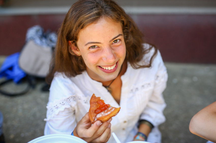 A zarándokok aztán átmentek a szállásra, az ófehértói általános iskolába, ahol bablevest és fánkot ebédeltek. Miközben kígyózott az iskola folyosóján a sor, a napfényes udvaron Hoskó Imola, a „zöldek” csoportvezetője elmondta, ez már a tizennegyedik zarándoklata. Az első alkalmakon főleg az tetszett neki, hogy mindenki szívből, imádságosan énekelt. Imola tizenéves korától kántor. Megtisztelő számára ebben a szolgálatban megélni, hogy a fiatalok lelkét felemelheti Istenhez a liturgikus énekek által. „Minden reggel van utrenye fél 7-kor. Tegnap 5 órakor volt, mégis sokan eljöttek rá. Esténként vecsernyét imádkozunk, napközben pedig imaórát. Ha beérünk egy községbe vagy városba, Mária-énekeket énekelünk, hiszen az Istenszülő felé tartunk.”
