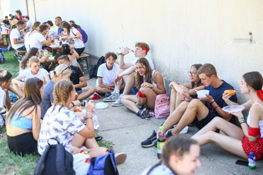 Egy hatalmas teherautóról közben lekerültek a csomagok is. A zarándokok bekuckózták magukat az iskola kertjébe, tornacsarnokába, folyosóira és osztálytermeibe. Akinek még volt energiája, a zöld füves focipályán rúgta a bőrt. Néhányan meglátogatták az Árpád-korból származó római katolikus templomot, ahol a hetvenes években előkerült freskók között megtalálták Magyarország legrégebbi Szent Erzsébet-ábrázolását is.