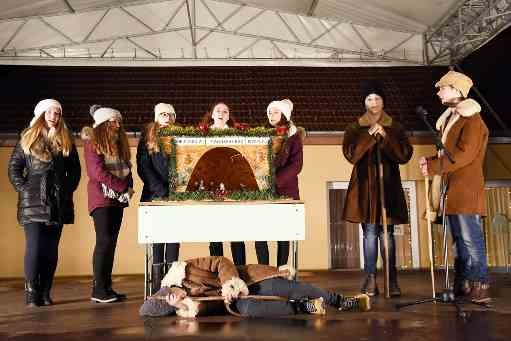 A város önkormányzata, a helyi egyházak és intézmények szervezésében megvalósult hagyományos programon idén az ajaki Tamási Áron Katolikus Általános Iskola tanulói adtak műsort. Versek szavalása után a Galsi János atya által betanított betlehemes játékot láthatták a jelenlévők a gyerekek előadásában. Ezt követte a harmadikos diákok pásztorjátéka, majd az iskolások ismét versekkel kedveskedtek a közönségnek.