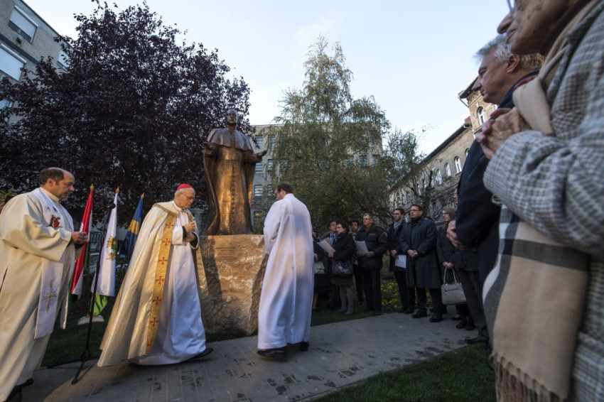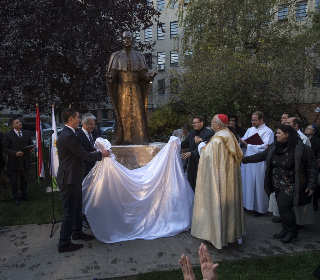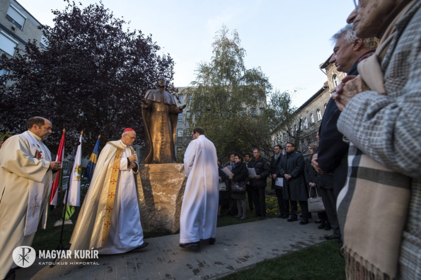 Mindszenty József egészalakos bronz szobrát, Hermann Zsolt szobrászművész alkotását Erdő Péter bíboros, prímás áldotta meg (A szobor alkotójával készült interjúnkat ITT olvashatják – a szerk.).