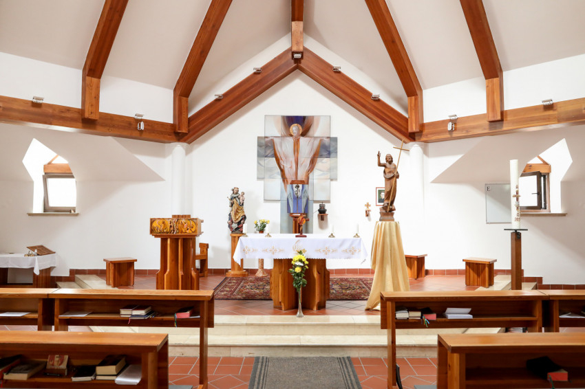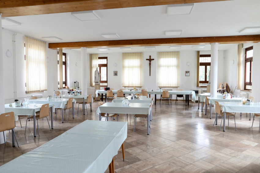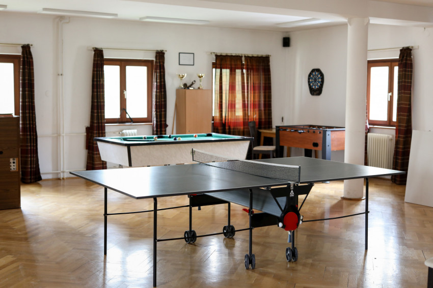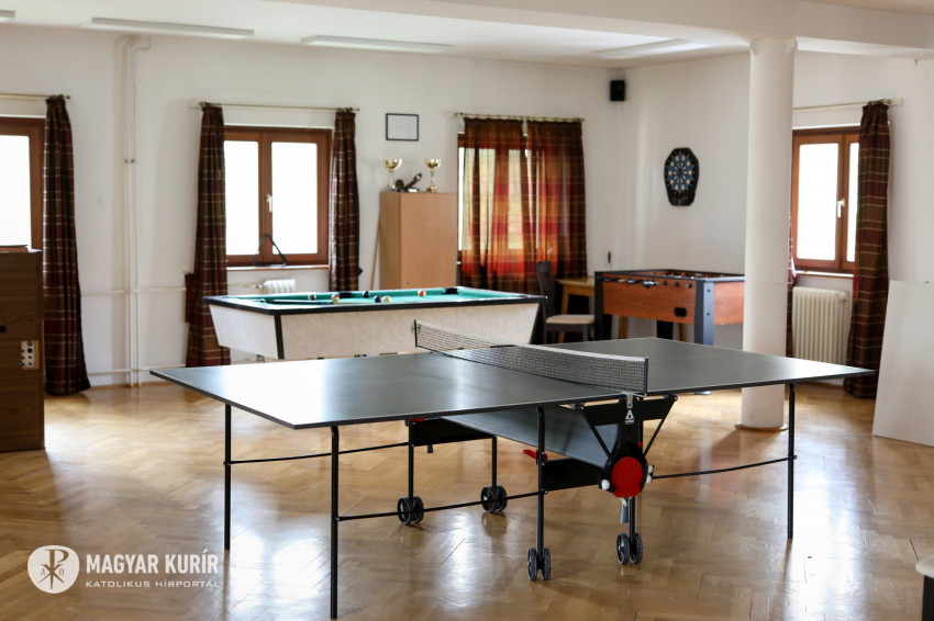 Hódi Dáviddal, aki a Kalocsa-Kecskeméti Főegyházmegye kispapja, a díszteremben beszélgettünk, a csocsó-, a biliárd- és a pingpongasztal szomszédságában. A terem színjátszásra is alkalmas, van itt színpadként szolgáló dobogó és lámpák is a világosításhoz.
