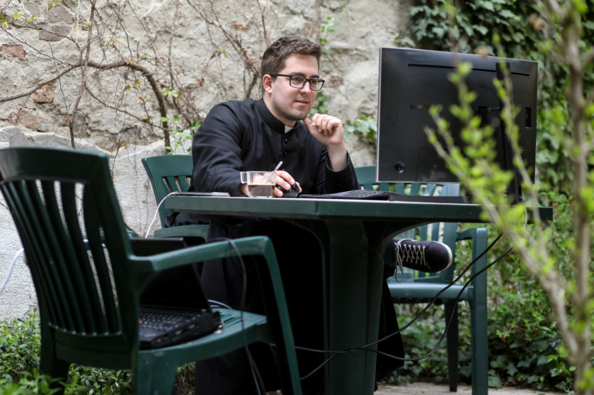 Dobay Miklós másodéves, a Váci Egyházmegye kispapja. Vele a szeminárium egyik folyosóján kialakított korzón beszélgettünk, ahol a pandémia alatt, a kényszerű bezártság idején is lehetőségük nyílt a szeminaristáknak a találkozásra, a beszélgetésre. Miklós, mielőtt Esztergomba került volna, egy évet az egyházmegyéje előkészítő szemináriumában töltött Kismaroson, a ciszterci nővérek monostorában. „Ez a közösségi kapcsolatok építésére, a lelkiségben való elmélyülésre szánt év olyan volt számomra, mint egy hosszú lelkigyakorlat. Részt vehettünk a plébániai életben, segítettünk a monostori szolgálatokban, és nagy hangsúly került az imaéletre is.”