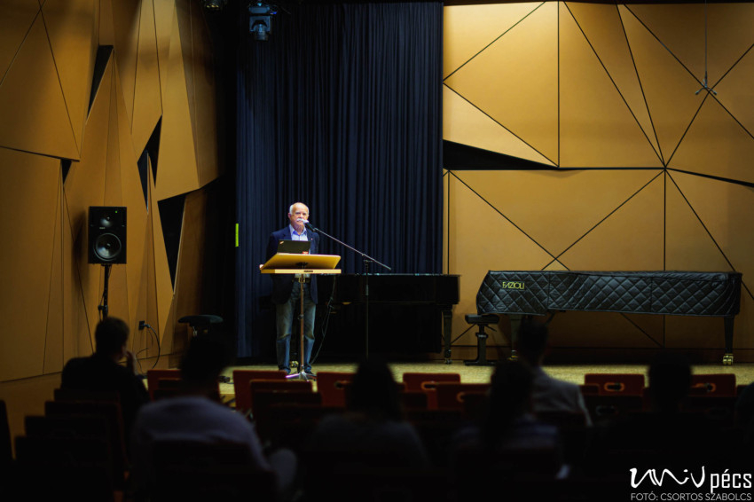 Köszöntőjében Aknai Tamás, a PTE Művészeti Karának egykori dékánja, professor emeritusa többek között arról a jelentős intézményteremtő tevékenységről beszélt, amelynek köszönhetően a zenei képzés is helyett kapott a felsőfokú oktatásban, és a Zeneművészeti Intézet 1998-ban integrálódott a Pécsi Tudományegyetem Művészeti Karába.