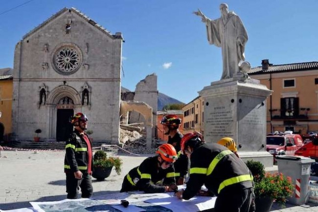 „Norciában Szent Benedek szobra épen maradt a romok között, ami fontos jel. Azt üzeni a norciaiaknak, hogy ott van velük. Ez a remény nagy jele” – mondta Gualtiero Bassetti perugiai érsek a szentmise előtt, amelyet a norciai érsek mutatott be.