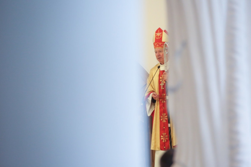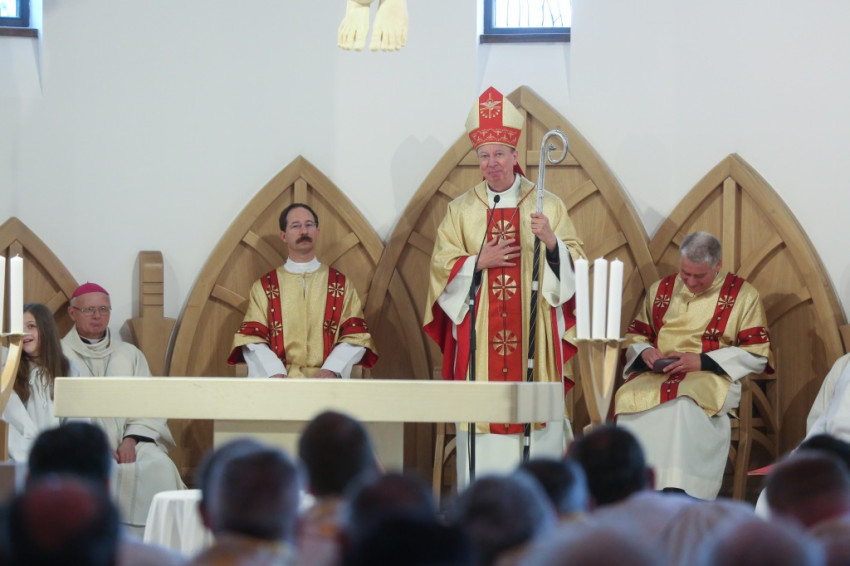 A főpásztor a homíliában kifejezte „a mindenki szívében lévő örömet”; felidézte a templomépítés előzményeit, kiemelve az egyetértésben zajló közös munkát, mely a Szentlélek ajándéka. Sok ajándékot kapunk, ha hiszünk az isteni szeretetben – a Lélek ajándékait is megkapjuk. Mindaz, ami emberré tesz minket, a Lélek ajándéka – hangsúlyozta. Pál apostol a Lélek gyümölcseiről ír – ezeket osztja meg velünk az Úristen.