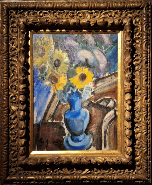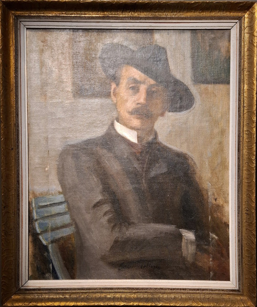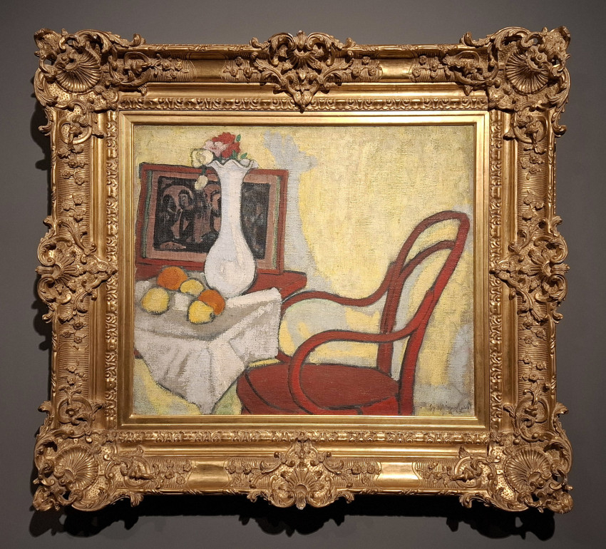 A keret viszont díszes, míves, talán pont ezért remekül ellenpontozza a kép belső, kevésbé kidolgozott karakterét. A festményt Galimberti Sándor készítette 1909-ben, és az Enteriőr Thonet-székkel és Gauguin metszettel címet adta neki. Megállapíthatjuk, hogy a kép nem éppen tipikus kifejeződése a századelő képzőművészetének. Hiányzik a tudatos képszerkesztés, (nyilván szándékosan), esetlegesnek hat a kompozíció, szokatlan a színválasztás is. Meghökkentő lehetett akkoriban az ilyen ábrázolás, amikor még csak legfeljebb csírájában jelent meg a modernizmus Európában. Galimberti Sándor, és mint látni fogjuk, felesége, Dénes Valéria is már nagyon korán az impresszionizmus és az expresszionizmus határán alkották meg életművűket.