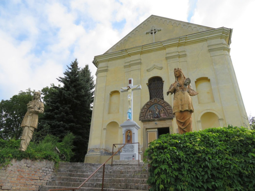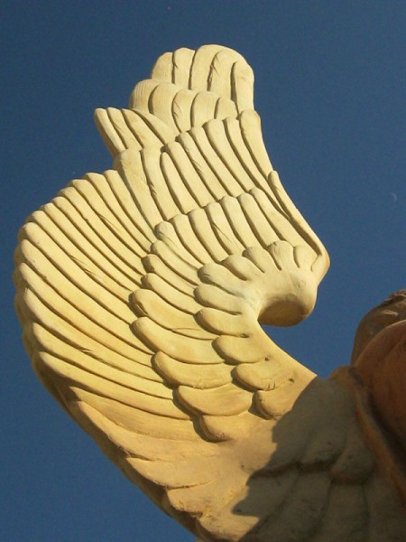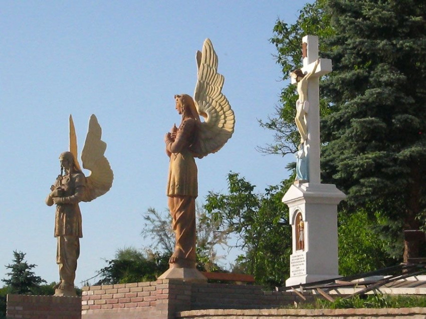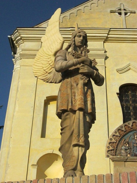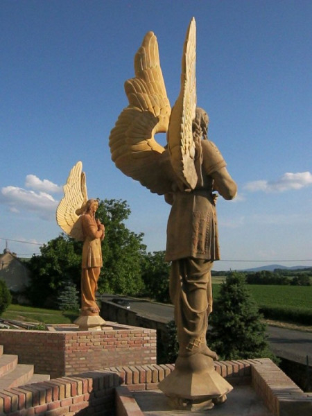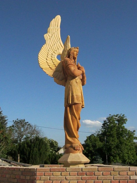 A szobrok plasztikája eltér a korabeli épületszobrok sablonjaitól. A nagyméretű, magyaros öltözetű, varkocsos angyalalakok a hitet és a szeretetet jelenítik meg: a keresztet tartó a hit, a másik, a szívét mutató angyal a szeretet szimbóluma.