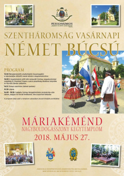 Idén is megrendezik a Szentháromság vasárnapján hagyományos német búcsút Máriakéménden. Május 27-én délután fél kettőkor indulnak a népviseletbe öltözött hívek a település központjától a kegytemplomhoz, ahol Kvanduk Frigyes általános püspöki helynök megáldja a felújított angyalszobrokat.