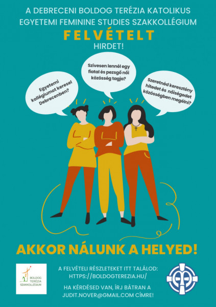 Szeretettel várják azon lányok jelentkezését a debreceni Boldog Terézia Szakkollégiumba, akik egyetemi éveik alatt szeretnének egy olyan fiatalos, értelmiségi női közösséghez tartozni, ahol keresztény hitüket bátran megélhetik, gyakorolhatják.