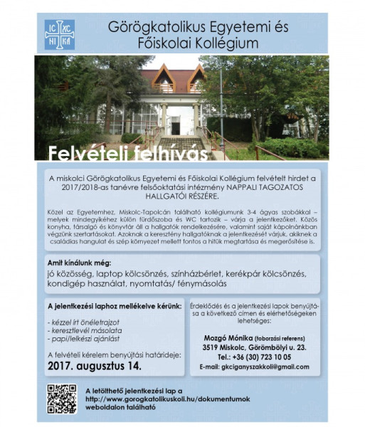 A miskolci Görögkatolikus Egyetemi és Főiskolai Kollégium felvételt hirdet a 2017/2018-as tanévre.