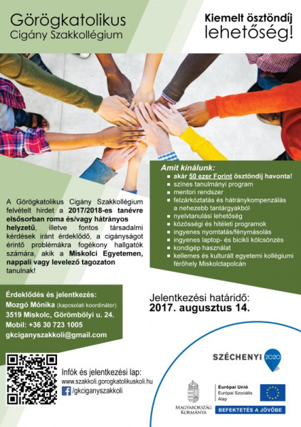 A Görögkatolikus Cigány Szakkollégium felvételt hirdet a 2017/2018-as tanévre elsősorban roma és/vagy hátrányos helyzetű, illetve fontos társadalmi kérdések iránt érdeklődő, a cigányságot érintő problémákra fogékony hallgatók számára, akik a Miskolci Egyetemen tanulnak.