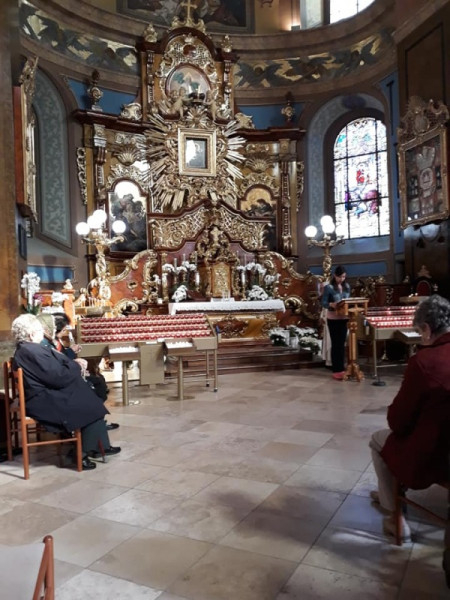 A szentmisét követően a hatszáz éves, nemrégiben felújított templomban a legszentebb áldozat bemutatását is celebráló Károly atya megszentelte a Máriapócson vásárolt kegytárgyainkat – rózsafüzéreket, szentképeket, imafüzeteket. Ez is sokunkban mély nyomokat hagyott, hiszen az Úr asztalára elhelyezett kegytárgyak azt jelképezték, hogy az Úr oltalmára bízzuk magunkat, és azokat, akik majd használni fogják. Majd Károly atya röviden ismertette velünk a templom múltját, és felhívta figyelmünket az évszázadok óta épségben maradt képre, mely azt ábrázolja, miként kérték Szűz Mária közbenjárását a benne bízók. Buzdított minket is, hogy merjünk mennyei Édesanyánkhoz fordulni kéréseinkkel, hiszen ő Pártfogónk az Istennél. Ezután az atyával közösen imádkoztunk a Magyarok Nagyasszonyához.
