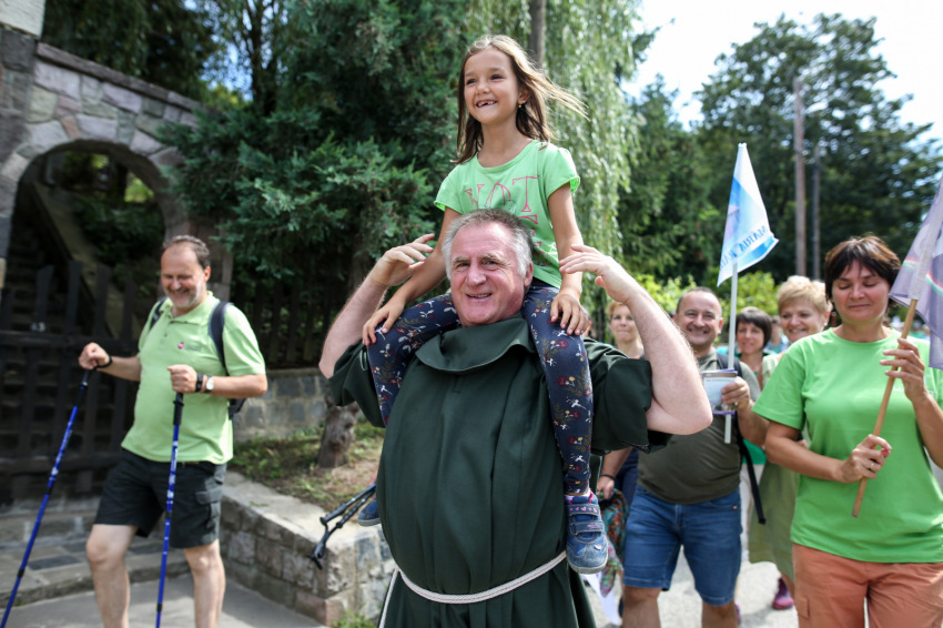 A szép, komótos út végén beérünk Visegrádra, s bár nem a Salamon-toronyhoz megyünk, mint Szent László, hanem a Keresztelő Szent János nevét viselő templomhoz, a mi kiengesztelődésünk is teljesült; legalábbis senki sem dönt amellett, hogy visszatérjen a kezdőponthoz, és újra végigmenjen az úton a tökéletesebb béke érdekében, amikor erre Böjte Csaba rákérdez. Csaba testvér nem fogy ki a szóból, de a gondolatból sem: a szentmise előtt arról beszél, hogy fenntartható vágyaink legyenek, mert nem lehet nyolcmilliárd embernek dübörgő terepjárója, azzal tönkretennénk a Földet, de az elérhető, hogy nyolcmilliárd ember gyönyörködjön a szépségben, a kiskertjét művelje, vagy bármilyen más módon dicsérje Isten alkotását. Ne a sátántól való örömökre vágyjunk, hanem az Istentől valókra! Az Úrral való örvendezés örömére, a közösségépítés örömére, a megismerés, a bölcsesség örömére, a szépség örömére, az alkotás örömére.