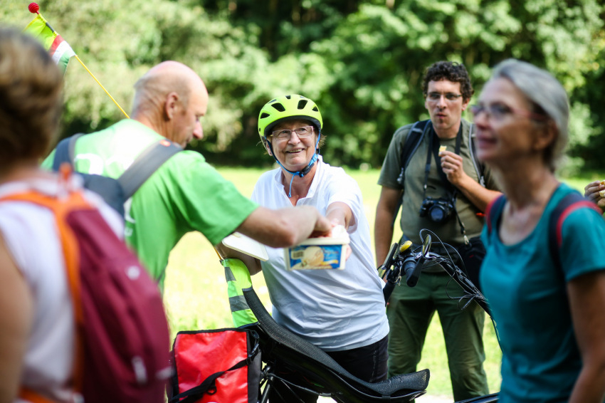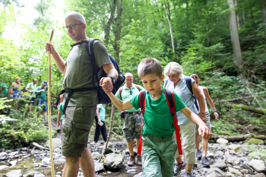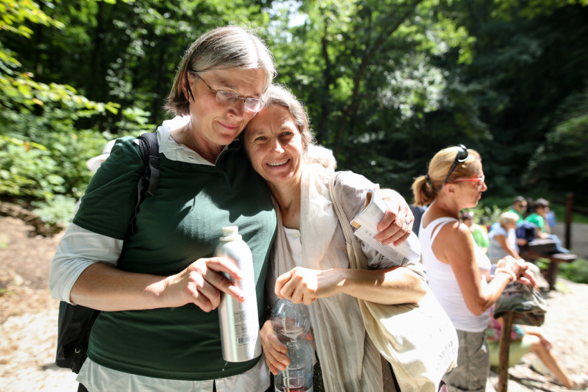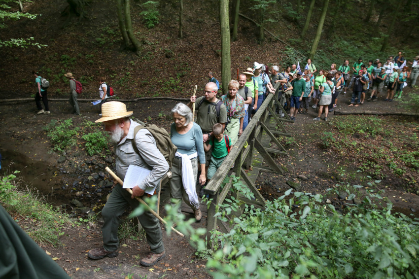 Fokozatosan vetjük bele magunkat a természetbe, először csak a ritmust vesszük fel az autóút mentén, aztán beszippant minket az erdő. Ahogy a cseppet sem monoton hatású, a zöld megannyi változatában díszlő ruháinkban haladunk, mintha mi magunk is a természet kis mozgó darabjai lennénk. A menet elején az énekes légkör a meghatározó, leghátulra már nem hat el a hangszóró: ott a kirándulás, a természetjárás jelleg domborodik ki. Az út során kétszer állunk meg hosszabb időre: Pilisszentlászlón egy egyórás ebédszünetre, majd az Apáti-kúti-patak gyönyörű, festői völgyén túljutva a Kaán-forrásnál, hogy vizet vegyünk. De a testi táplálék mellett egyik helyen sem marad el a lelki eledel sem: egy–egy tized rózsafüzér, egy-két gondolat az enciklikából és Böjte Csaba gondolatai, aki ferences szerzetesként arra is törekszik, hogy a természetnek is a kisebb testvére legyen. Emellett egy nyugdíjas erdésznek köszönhetően, aki már több mint húsz éve lakik Szentlászlón, minden egyes állomásnál új és új titkokat tudhatunk meg a környékről.