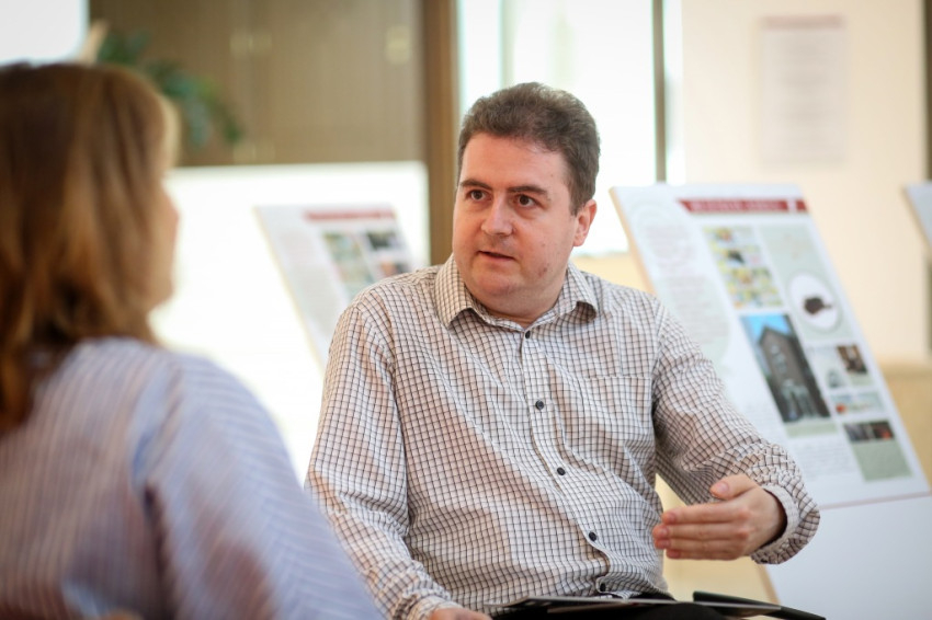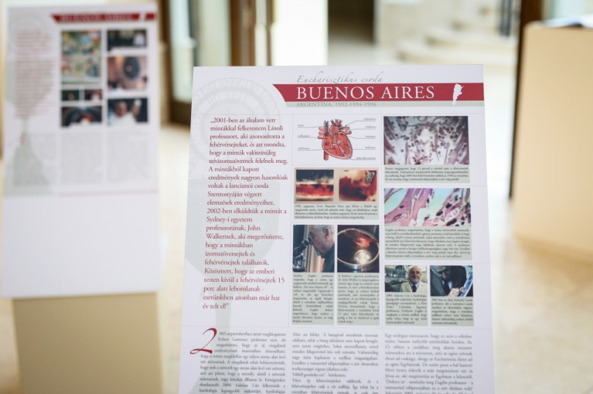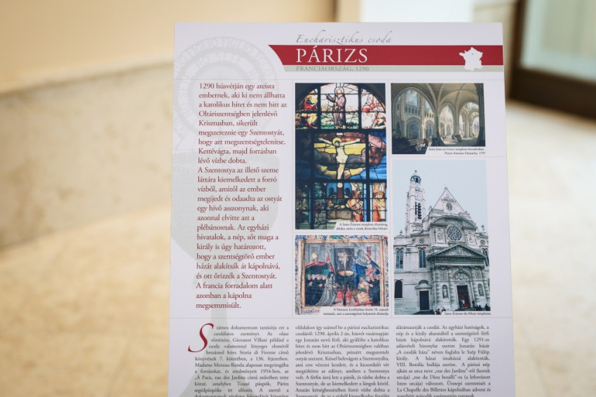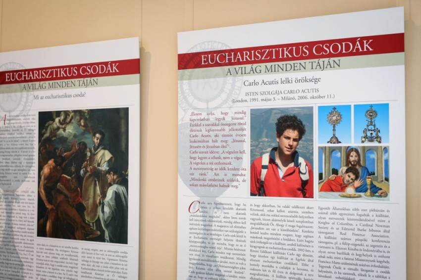 – A Nemzetközi Eucharisztikus Kongresszus (NEK) egyik előkészítő rendezvénye a kiállításunk. Kiindulásként azon gondolkodtunk, hogyan lehetne a széles látogatói közönség számára tematizálni az Eucharisztiát. Fábry Kornél, a NEK általános titkára vetette fel, hogy vegyünk alapul egy itáliai – időközben több nyelvre lefordított – honlapot, amely a világ különböző pontjain a középkortól napjainkig előfordult, több mint száz, a Szentszék által is elismert vonatkozó csodát dokumentálja. Elkezdődött az anyag magyar fordítása, de mivel egy kiemelt művészi színvonalú helyszínre, a Pesti Vigadóba terveztük a tárlatot, a tablókon túlmutató, eredeti művészi alkotásokat szerettünk volna bemutatni. A művészeti megközelítésnek a Török Csaba teológia tanárral folytatott előzetes elvi megbeszélések is irányt szabtak. Ő válogatta a kiállítás részét képező, Aquinói Szent Tamástól származó idézeteket, és megírta a falakra kihelyezett rövidebb, illetve a szórólapon szereplő bővebb szövegeket, melyek olvasásával egyidejűleg javasoljuk a kiállítás megtekintését. A tárlat elemeinek vizuális összehangolását, számos technikai probléma megoldását, a grafikai tervezést Zalavári Tibor látványtervezőnek köszönhetjük.