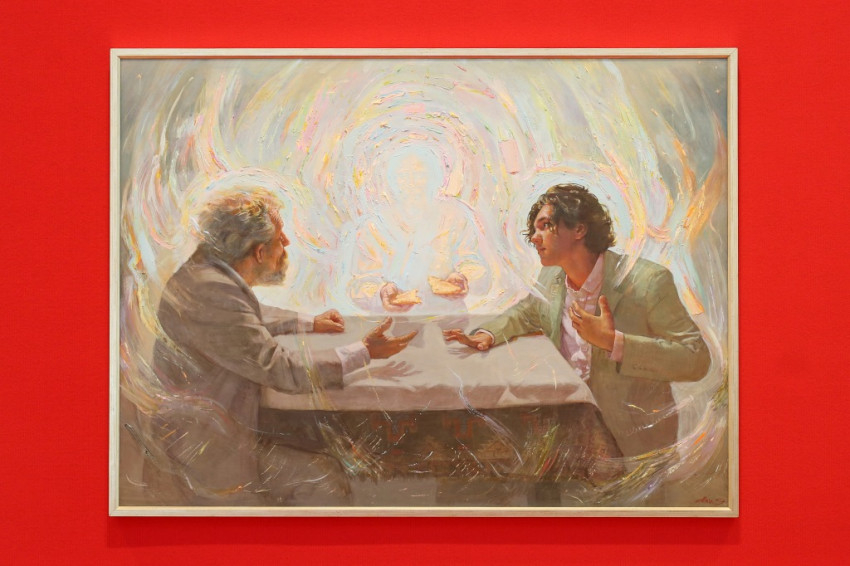– Atlasz Gábor festményét azért szeretem, mert Caravaggio emblematikus Emmauszi vacsoráján kívül nem nagyon találunk olyan ábrázolást, amely hasonló drámaisággal értelmezné a Szentírás szövegét. Pedig ez kulcsjelenet az Eucharisztia titkának megértésében. Egy olyan csodás esemény, amelyen keresztül az igazságra, a valóságra, Jézus folytonos jelenvalóságára tudtak következtetni az apostolok. A kiállításra készülve, a gyűjteményünket és különböző művészi életműveket szemlézve nem került elém olyan alkotás, amely a tanítványok felismerését, a kenyértörés jelentőségét mai módon kifejezte volna. Atlasz Gáborral korábban már dolgoztam, így ismerem a munkáit, és tudom, hogy mélyen foglalkoztatja a fény szerepe a reális és a transzcendentális világ kapcsolatának megjelenítésében. Néhány hónappal ezelőtt megkerestem, megkértem, hogy foglalkozzon a témával, és vegye figyelembe a kiállítás formálódó koncepcióját, vagyis a csodákon túlmutató, az átlényegülés fogalmával leírható liturgikus Isten–ember-kapcsolat bemutatásának szándékát. Annyira belelkesült, hogy rögtön vázlatokat készített, majd a kész műben igazi kortárs ― a figurális és az absztrakt festészet határán mozgó –, mély értelmű alkotás született általa.